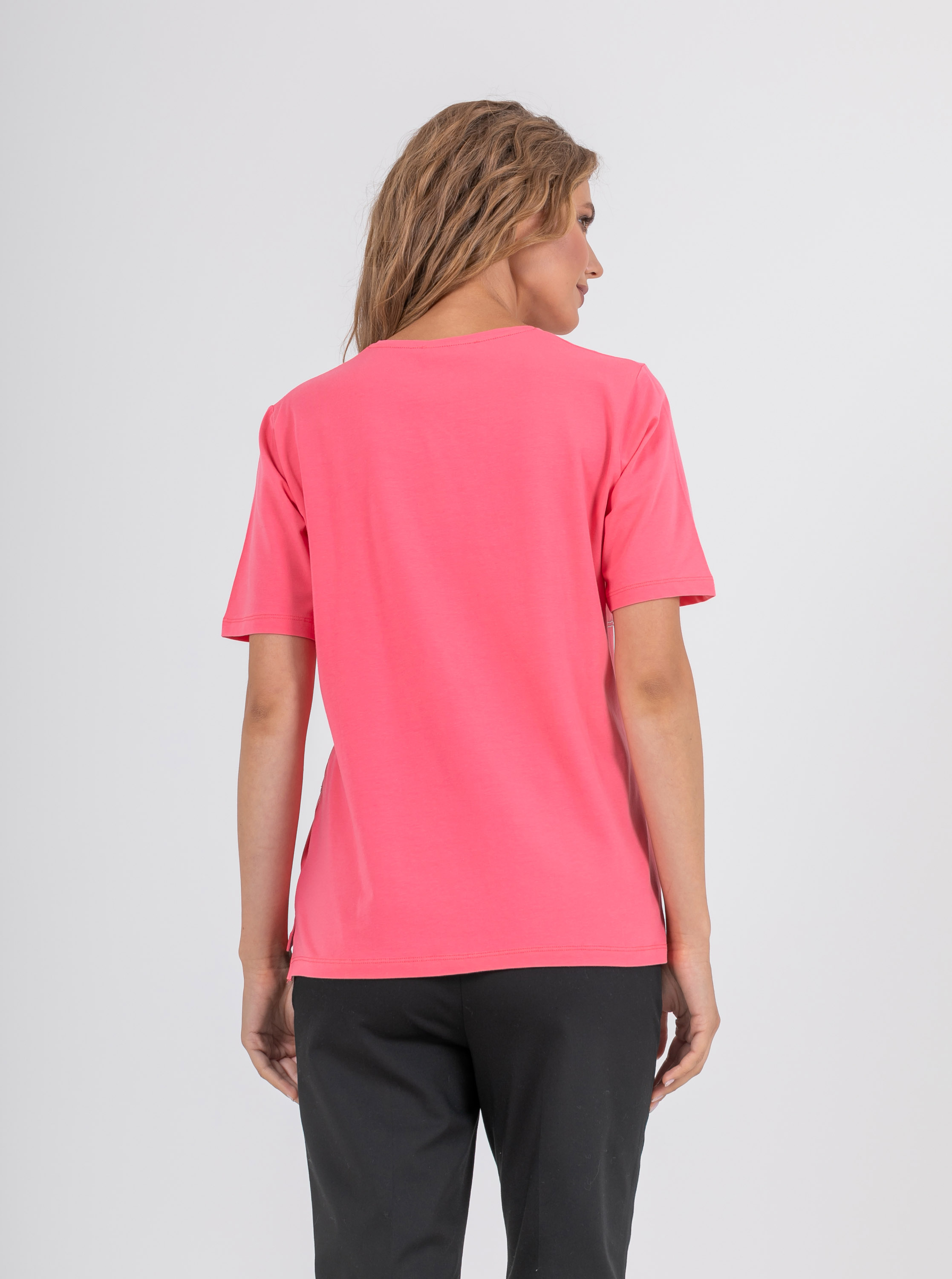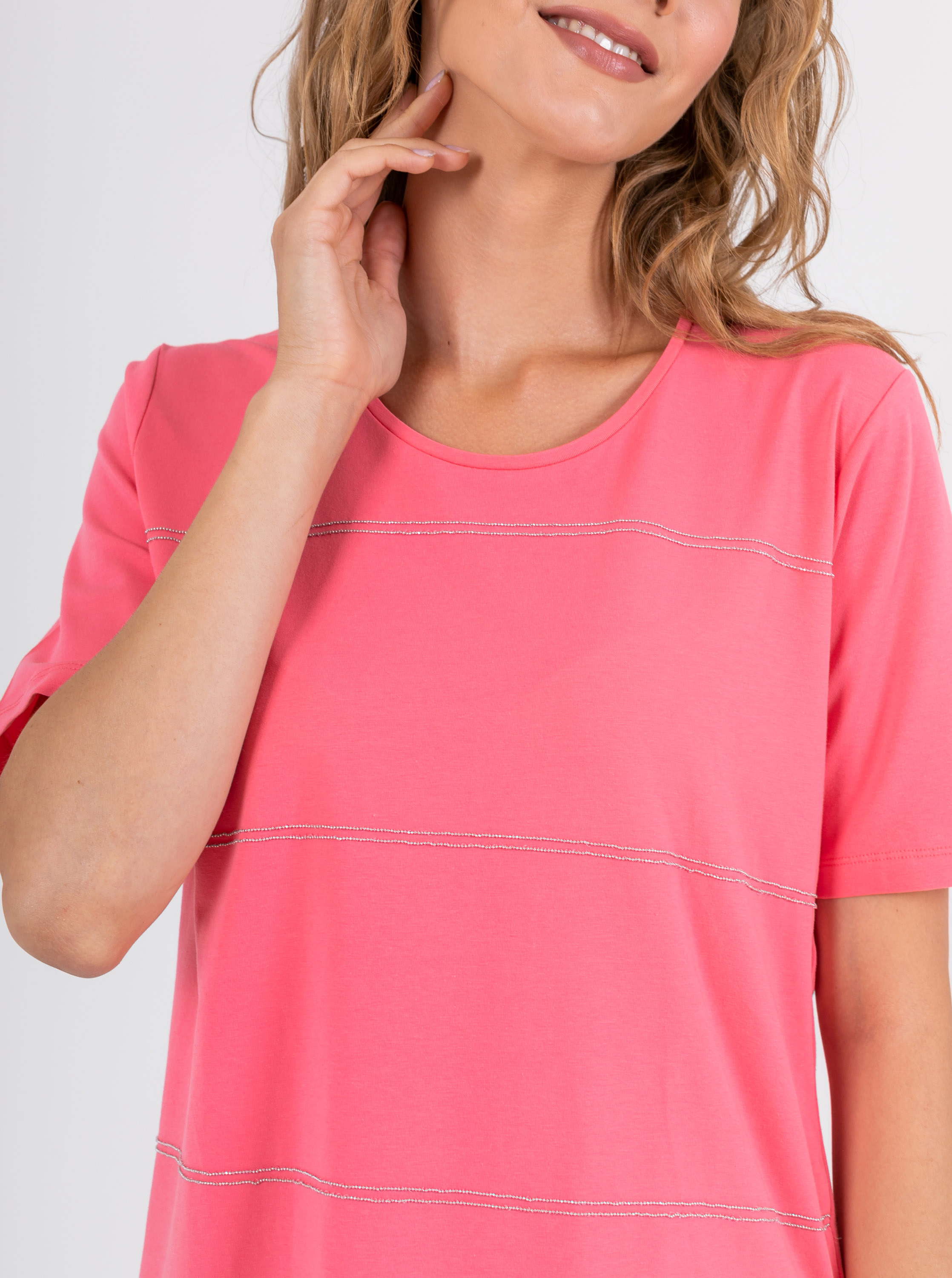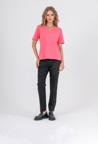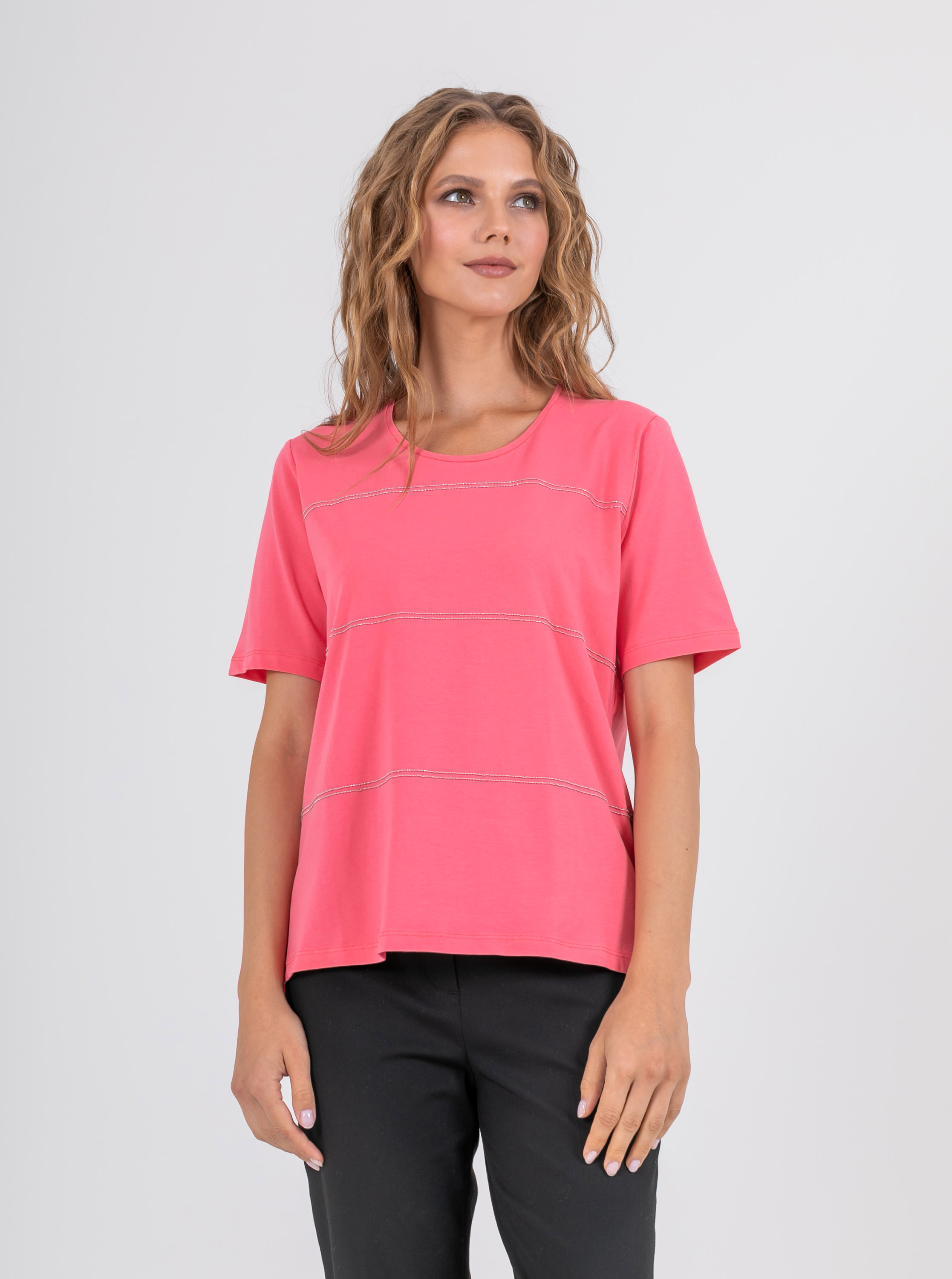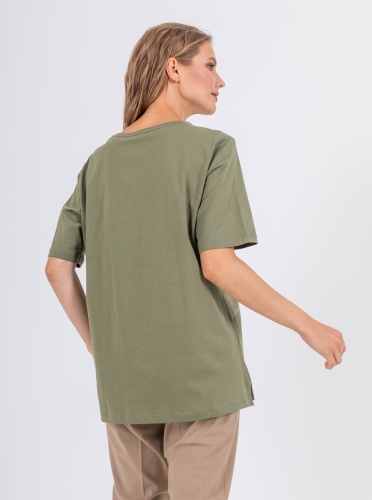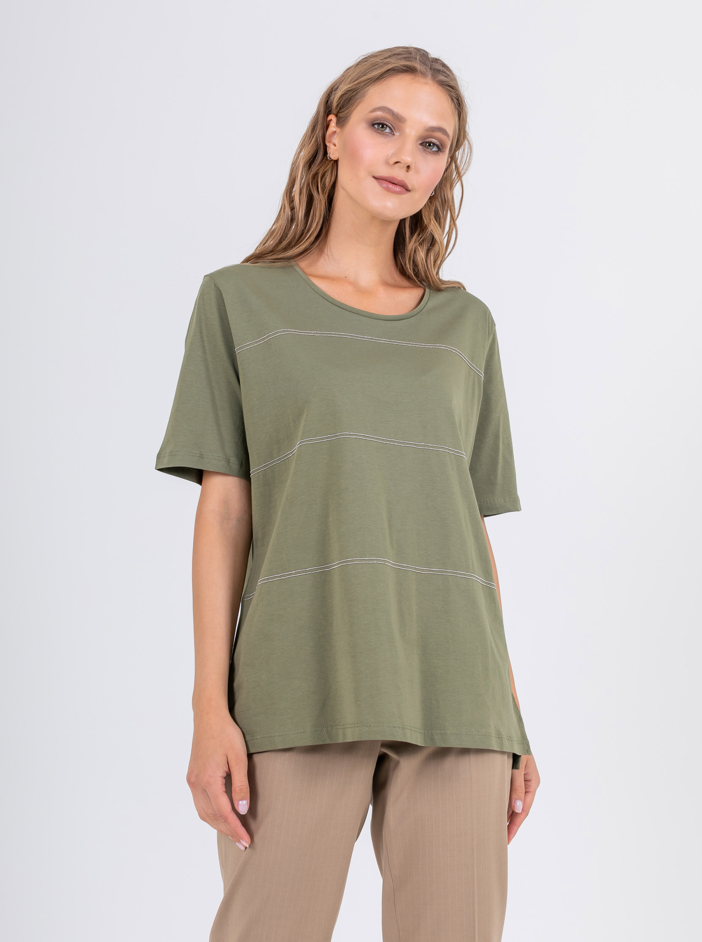 На сайте указаны российские размеры. Мягкая футболка из 100% хлопка. Свободный крой, круглый вырез горловины, рукава 1/3, слегка удлиненная спинка, по бокам небольшие разрезы. Перед модели акцентирован полосками из декоративных блестящих страз.