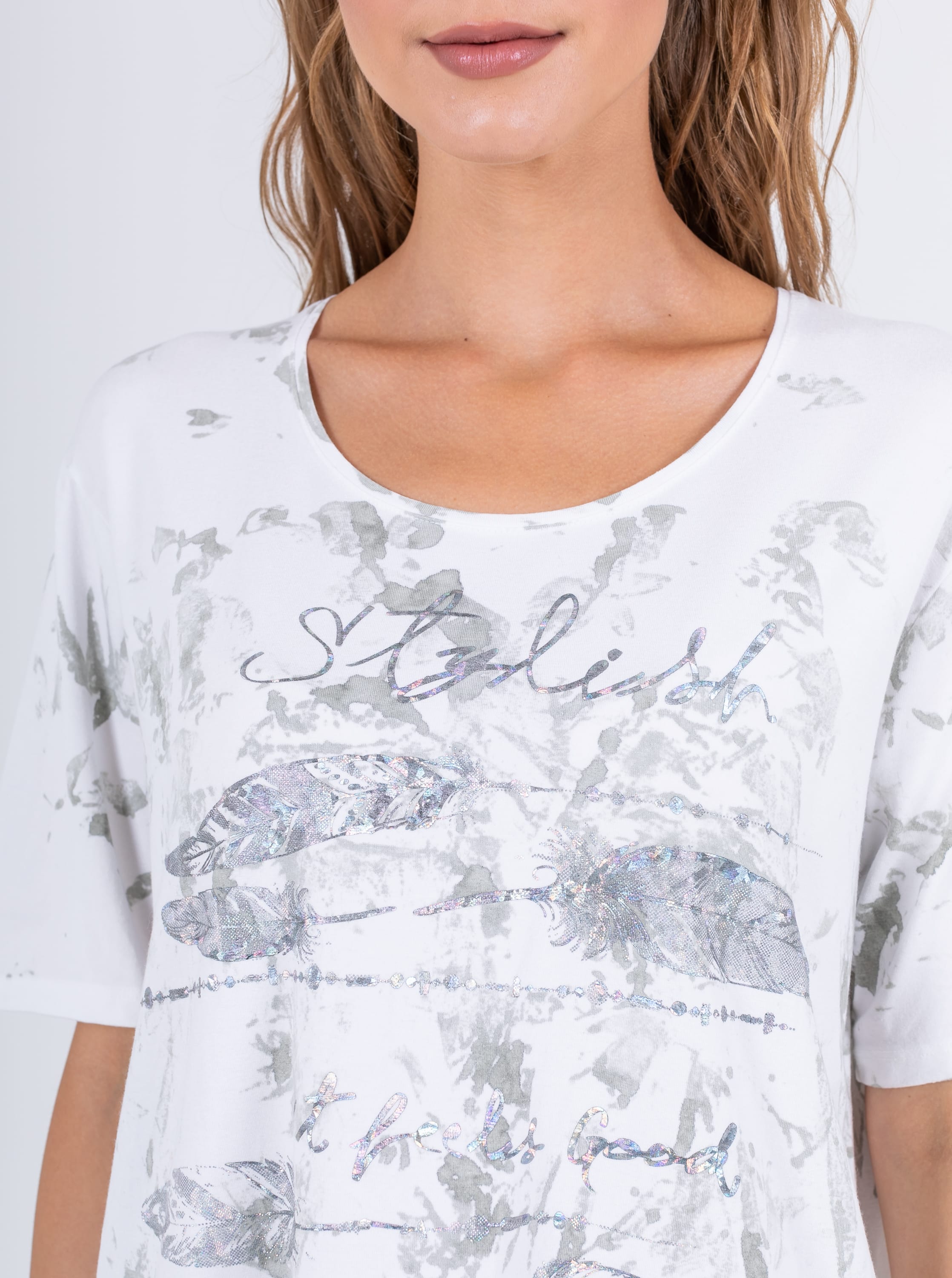 На сайте указаны российские размеры. Ткань: изготовлена из высококачественной вискозы (92%) – экологичного материала, хорошо пропускающего воздух и впитывающего излишки влаги, и эластана (8%), придающего ткани упругость. Крой: удлиненная футболка с цельнокроеным рукавом, который добавляет комфорта при носке и не стесняет движений, насколько активными вы бы не были. Модель идеально скрывает недостатки, не облегает фигуру, что делает ее идеальной вещью для женщин с пышными формами и большой грудью. Имеет неглубокий круглый вырез. Отделка: принт по всей поверхности футболки: в передней части на элементы рисунка нанесено сверкающее покрытие, которое выдерживает множество циклов стирки. В задней части футболки принт без нанесения.