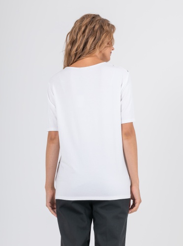 Футболка средней длины прямого силуэта из легкой, мягкой вискозы с добавлением эластана. По переду выполнен нежный принт. Укороченные втачные рукава. Круглый вырез горловины с отделочной строчкой по переду.