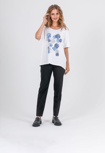 На сайте указаны российские размеры. Ткань: изготовлена из высококачественной вискозы (92%) – экологичного материала, хорошо пропускающего воздух и впитывающего излишки влаги, и эластана (8%), придающего ткани упругость. Крой: футболка удлиненная прямого силуэта с коротким свободным рукавом-регланом. Классическая модель с круглым вырезом – база, которая прекрасно смотрится на женщинах разного роста и комплекций. Обеспечивает максимальный комфорт, прекрасно садится по фигуре. Отделка: футболку украшает стильный принт с актуальными уже несколько сезонов монстерами. Вырез обрамляет контрастная синяя строчка-зигзаг, добавляющая образу оригинальности.