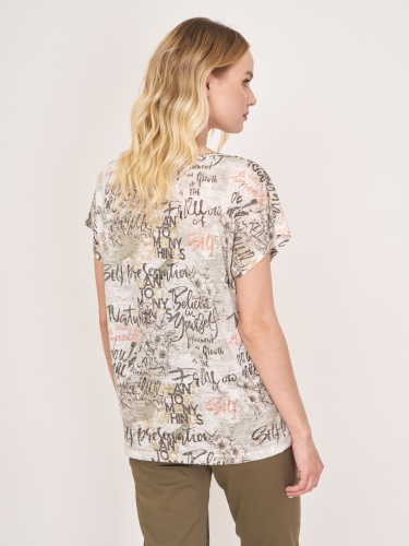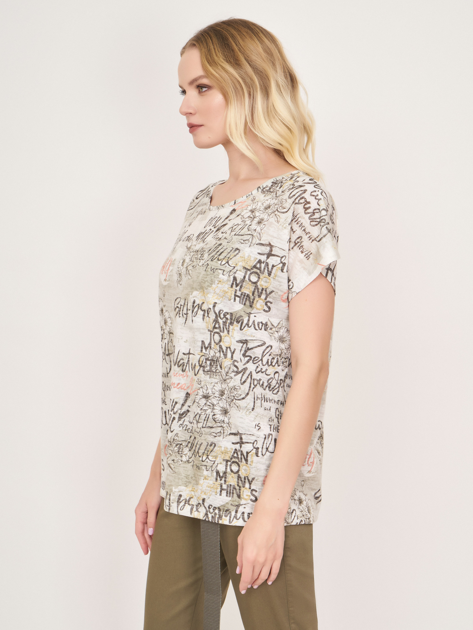 На сайте указаны российские размеры. Прямой трикотажный хаки джемпер-футболка с круглым вырезом, с коротким рукавом, с цветочным рисунком, с надписями. Длина по спинке: 64 см. Рост модели: 176 см.