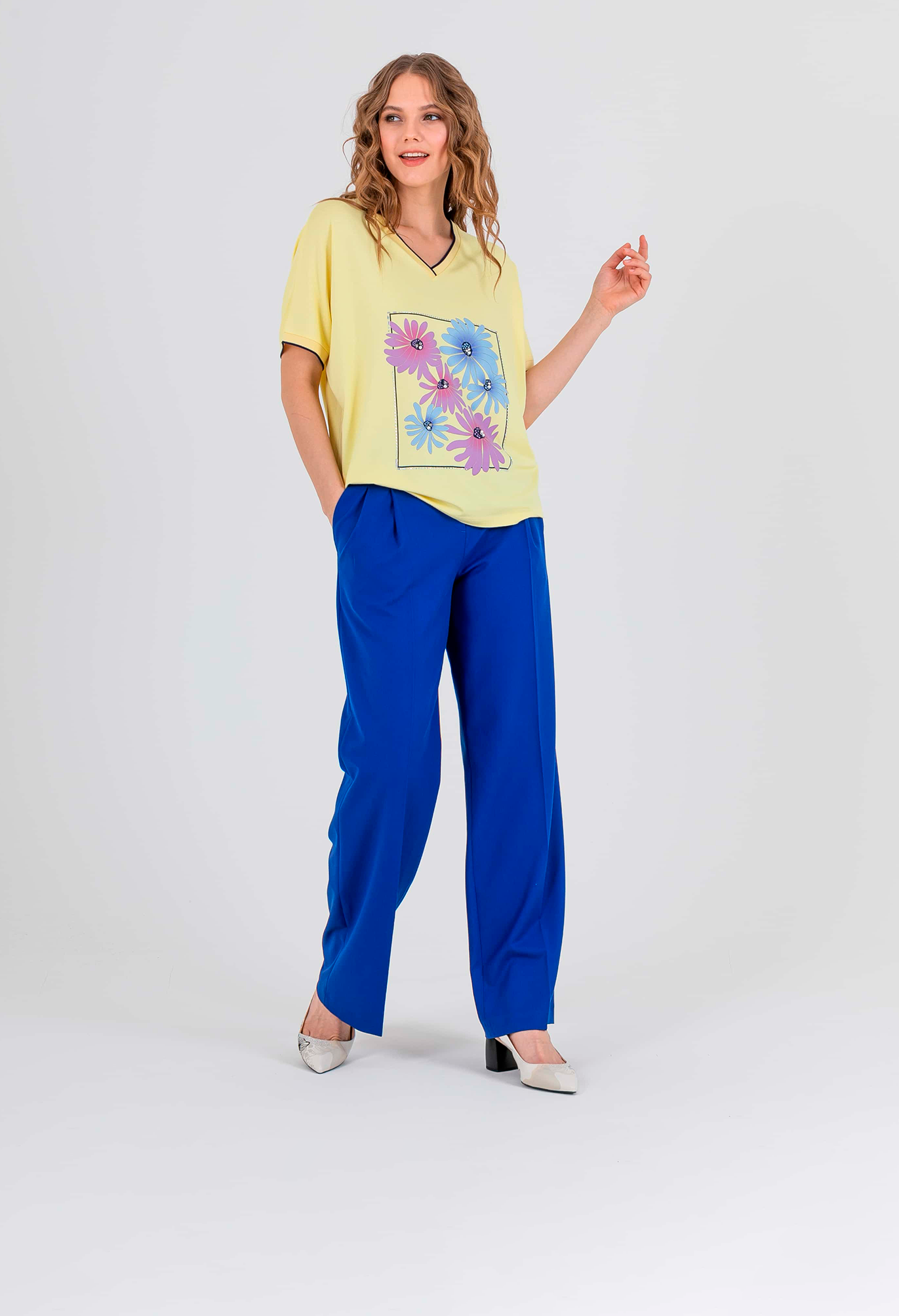 На сайте указаны российские размеры. Оверсайз футболка средней длины прямого силуэта из легкой, мягкой вискозы с добавлением эластана. По переду выполнен яркий принт и аппликация со стразами. Укороченные цельнокроеные рукава с манжетами и контрастным кантом. V-образный вырез горловины, обработанный трикотажной косой бейкой с контрастным кантом.
