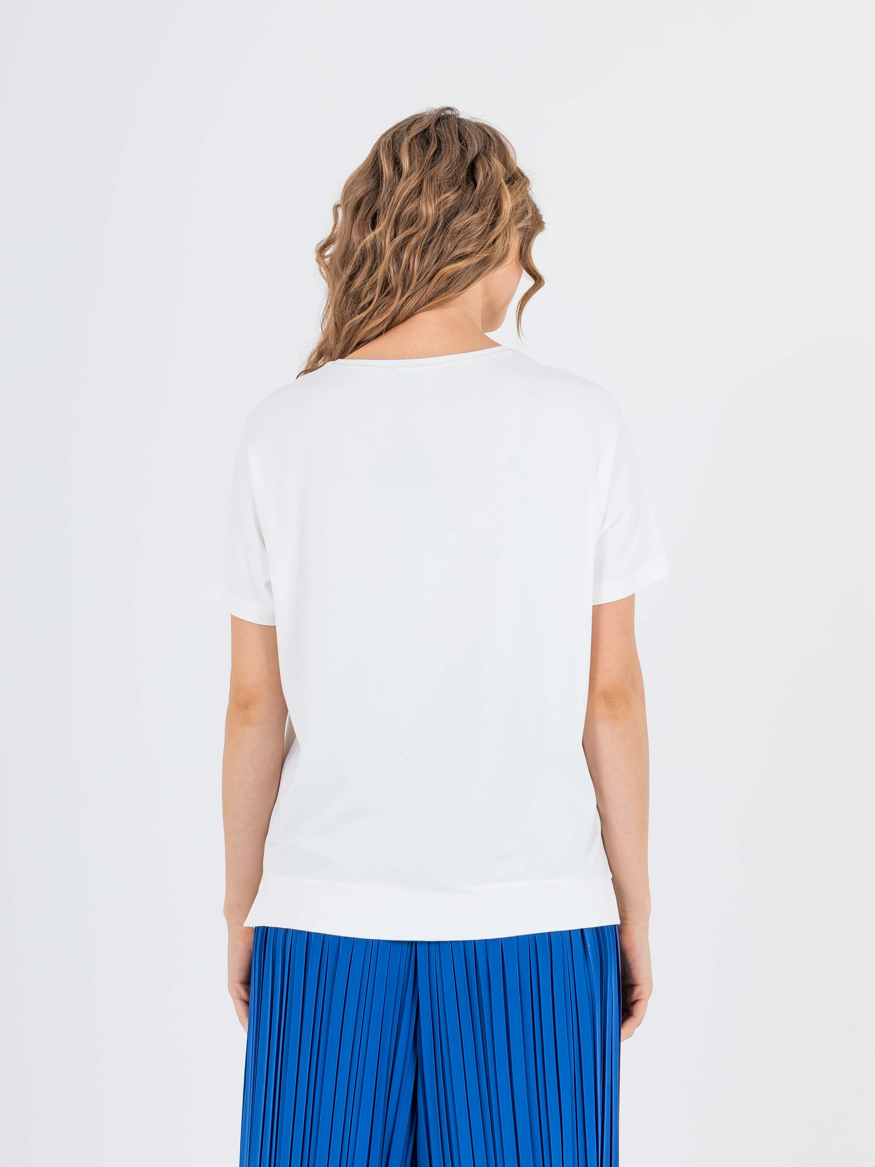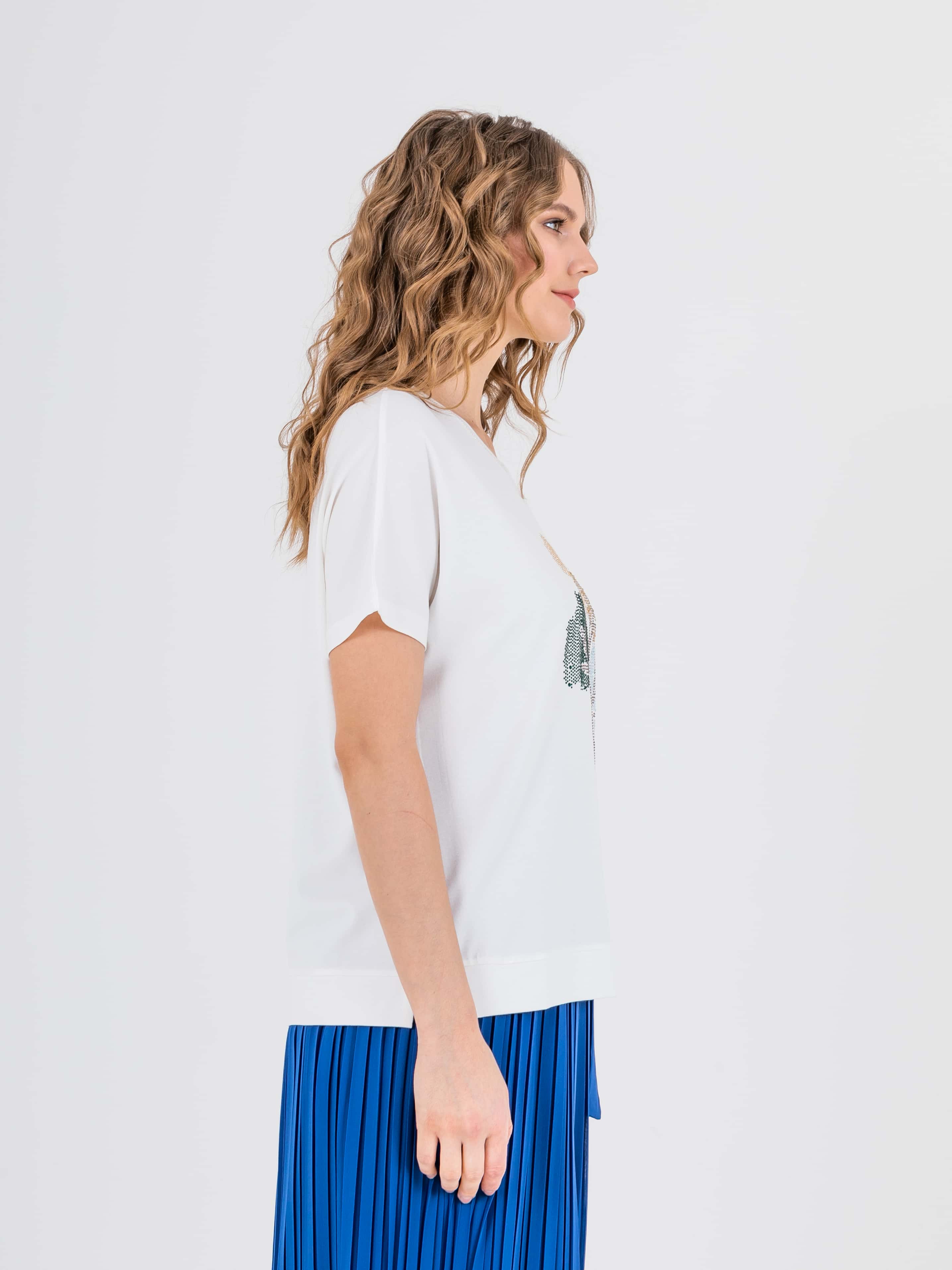 На сайте указаны российские размеры. Футболка средней длины прямого силуэта из легкой, мягкой вискозы с добавлением эластана. Перед и спинка по низу обработаны манжетой с разрезами в боковых швах. По переду выполнена эффектная аппликация со стразами Укороченные цельнокроеные рукава. Круглый вырез горловины с отделочной строчкой.