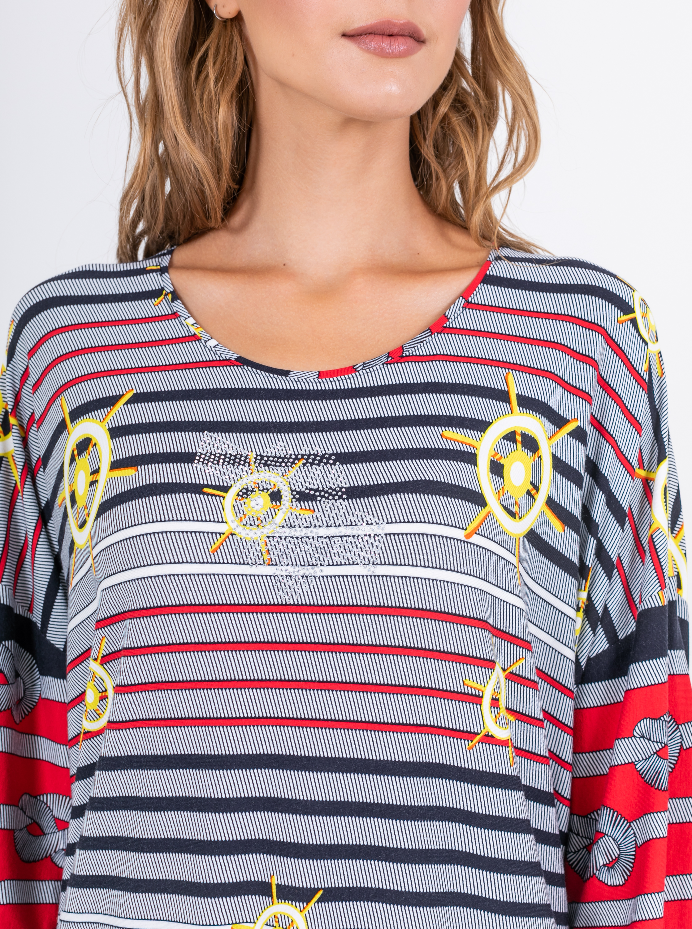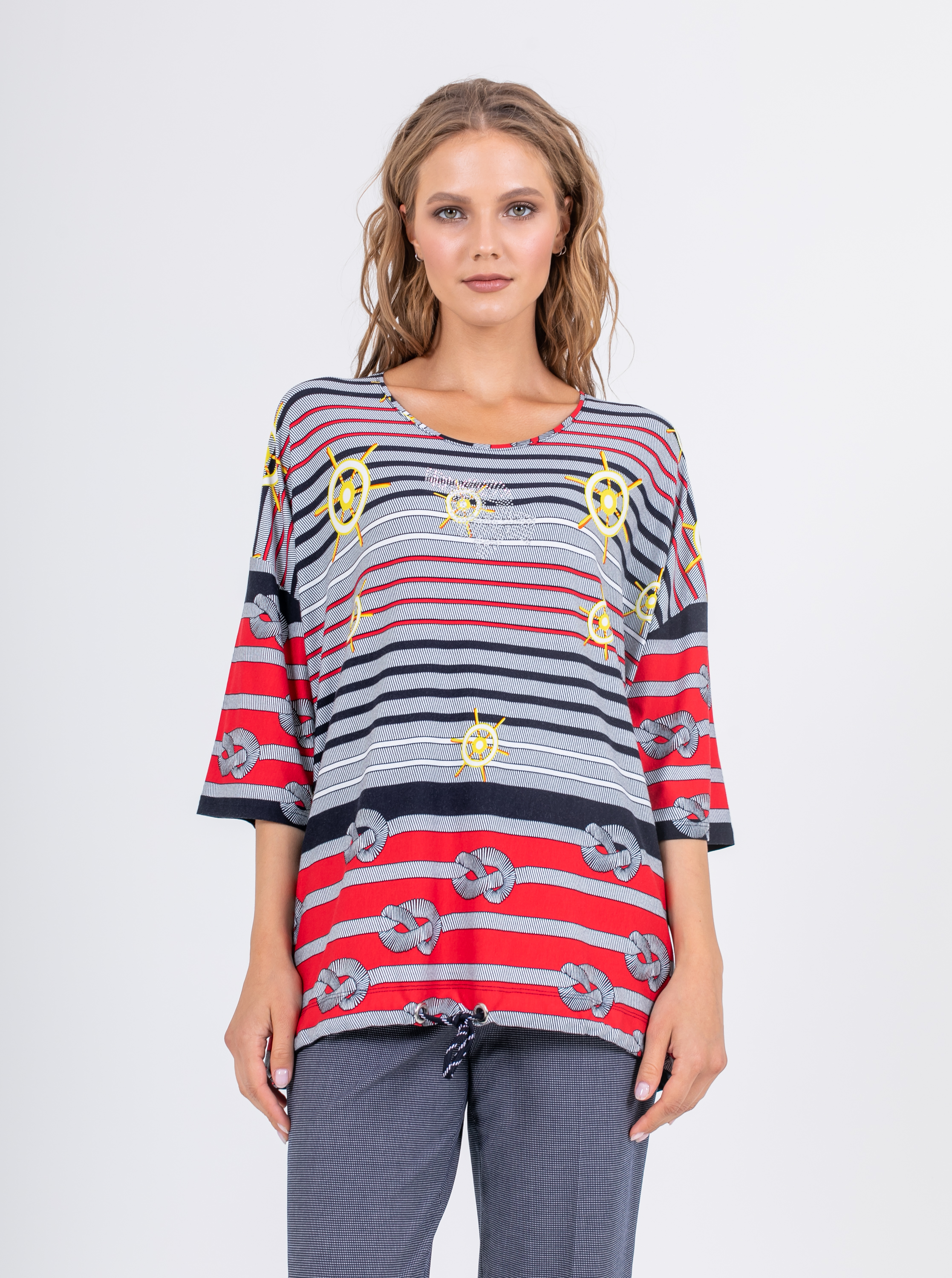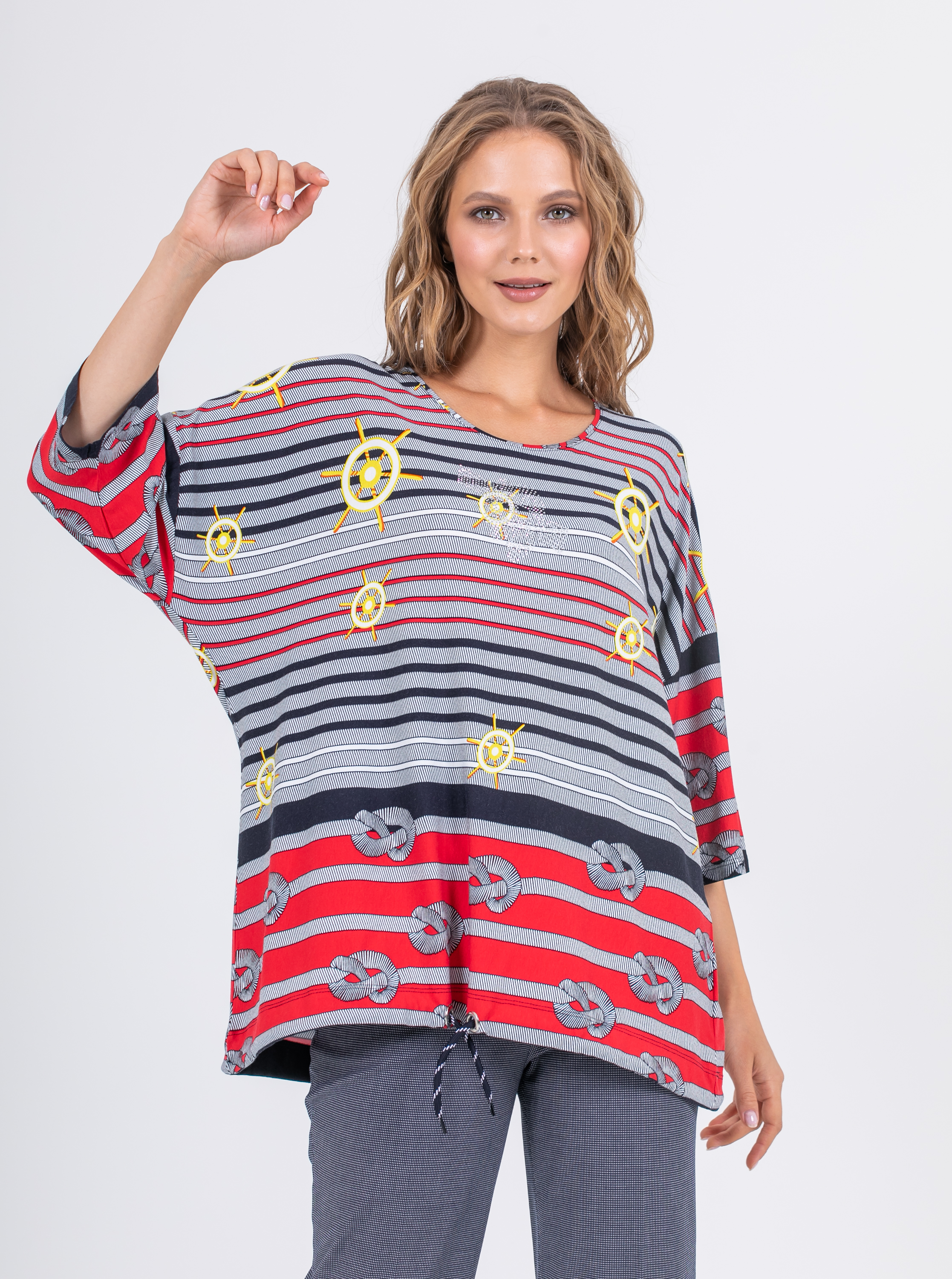 Длинная оверсайз футболка прямого силуэта из легкой, мягкой вискозы с добавлением эластана. По переду и спинке выполнен яркий морской принт. Низ обработан кулиской и полосатым шнуром, для регулировки объема. Втачные рукава длиной ¾ со спущенной линией плеча. Круглый вырез горловины.