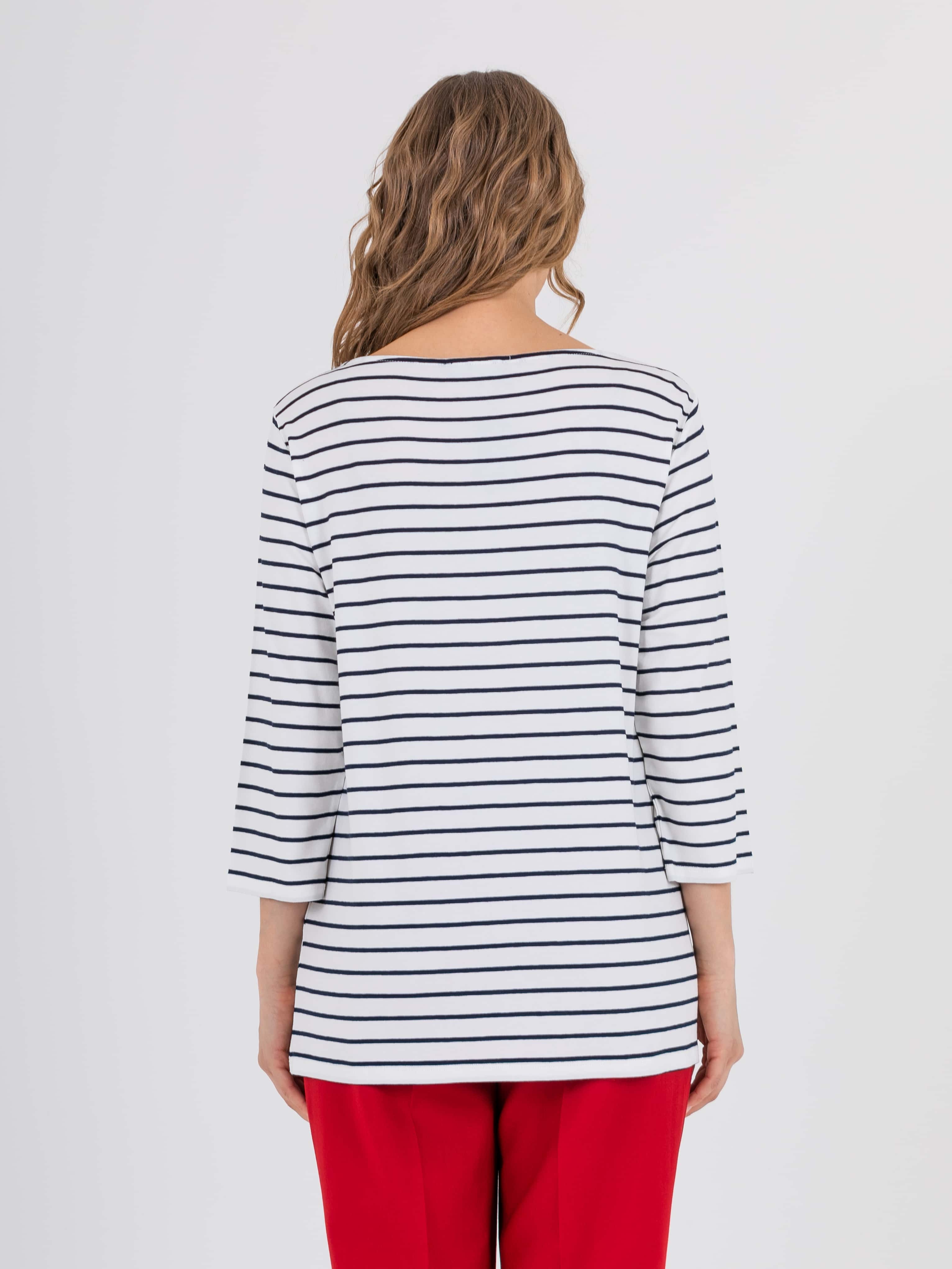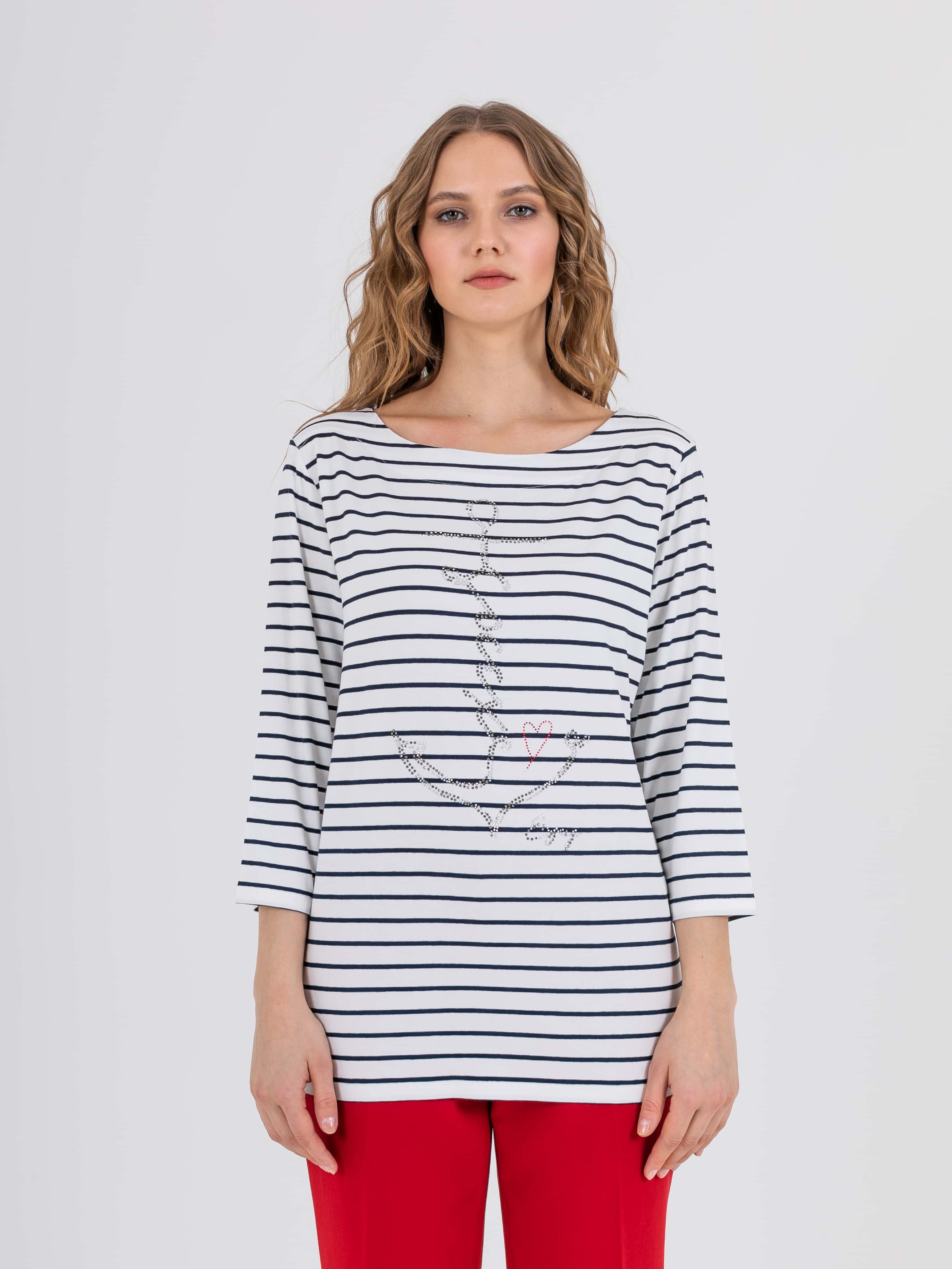 На сайте указаны российские размеры. Ткань: изготовлена из высококачественной вискозы (92%) – экологичного материала, хорошо пропускающего воздух и впитывающего излишки влаги, и эластана (8%), придающего ткани упругость. Крой: футболка удлиненная прямого силуэта, закрывающая область паха, может выступать как туника. Универсальности модели добавляет рукав-реглан ¾, который подарит уютное тепло в холода и защитит руки от ярких солнечных лучей на отдыхе. Футболка имеет неглубокий круглый вырез, подчеркивающий красоту шеи. Отделка: классическую футболку-тельняшку украшает рисунок, выложенный из умеренно сияющих страз. Стразы надежно закреплены, выдерживают множество стирок.