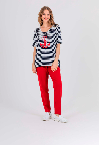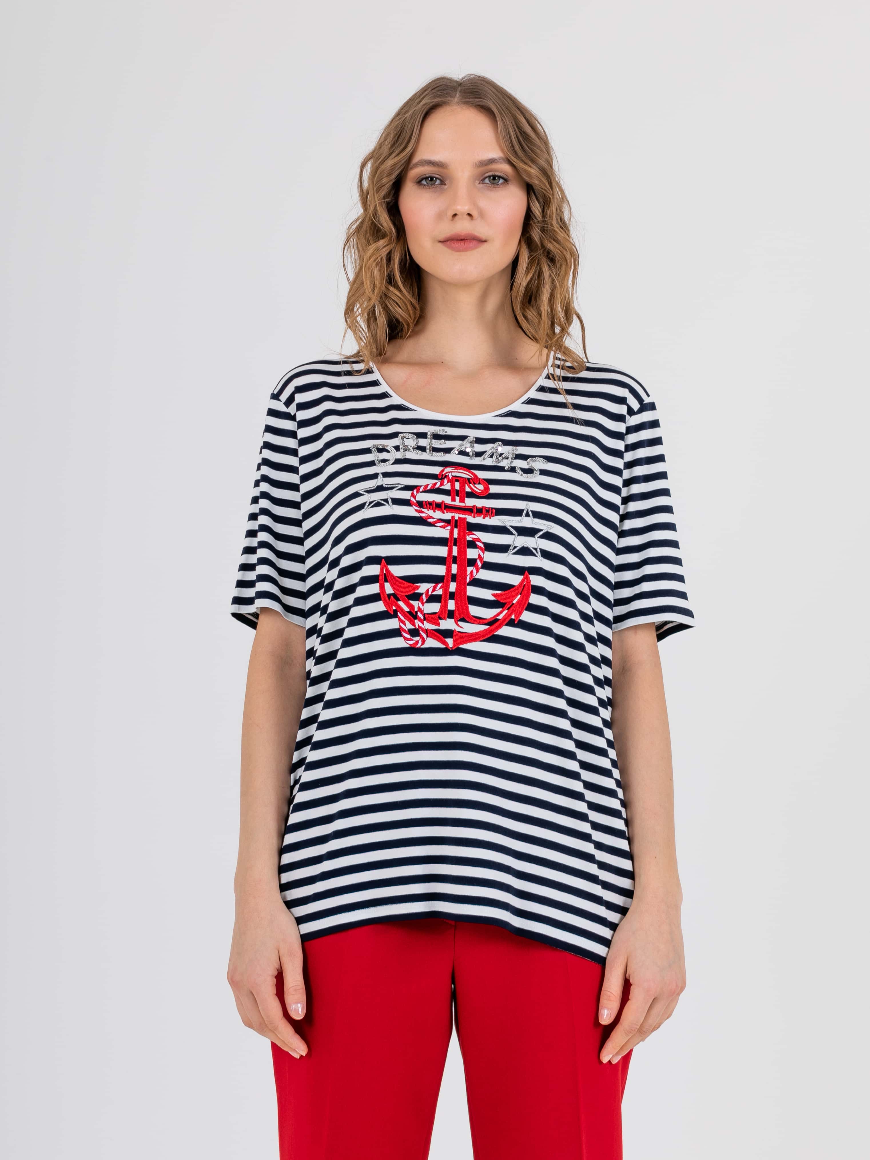 На сайте указаны российские размеры. Ткань: изготовлена из высококачественной вискозы (92%) – экологичного материала, хорошо пропускающего воздух и впитывающего излишки влаги, и эластана (8%), придающего ткани упругость. Крой: классическая футболка-тельняшка с круглым вырезом и свободным коротким рукавом-регланом. Имеет достаточную длину, закрывает область живота, не поднимается вверх при движении и поднятии рук. Футболку можно заправить или носить навыпуск. Отделка: футболку украшает композиция из декоративных элементов: надпись «dream» выполнена из серебристых пайеток, а яркий морской якорь и звезды вышиты атласными нитями.
