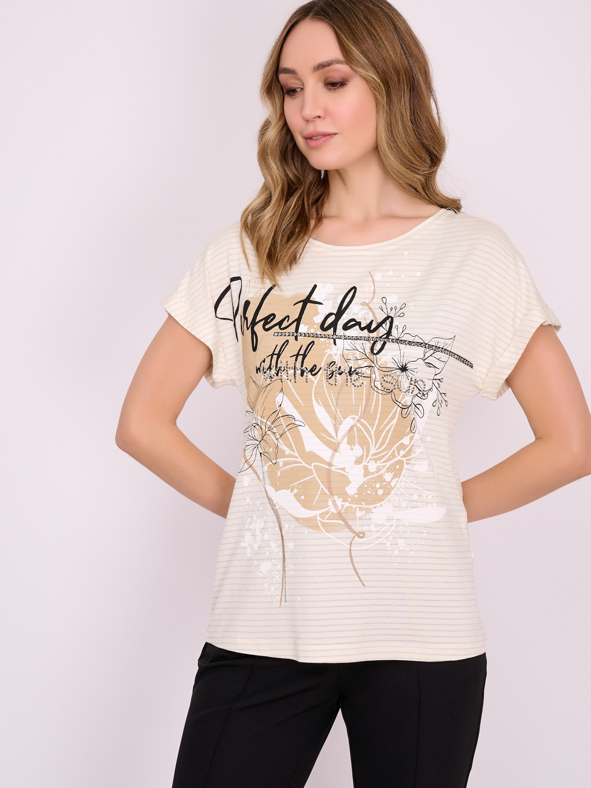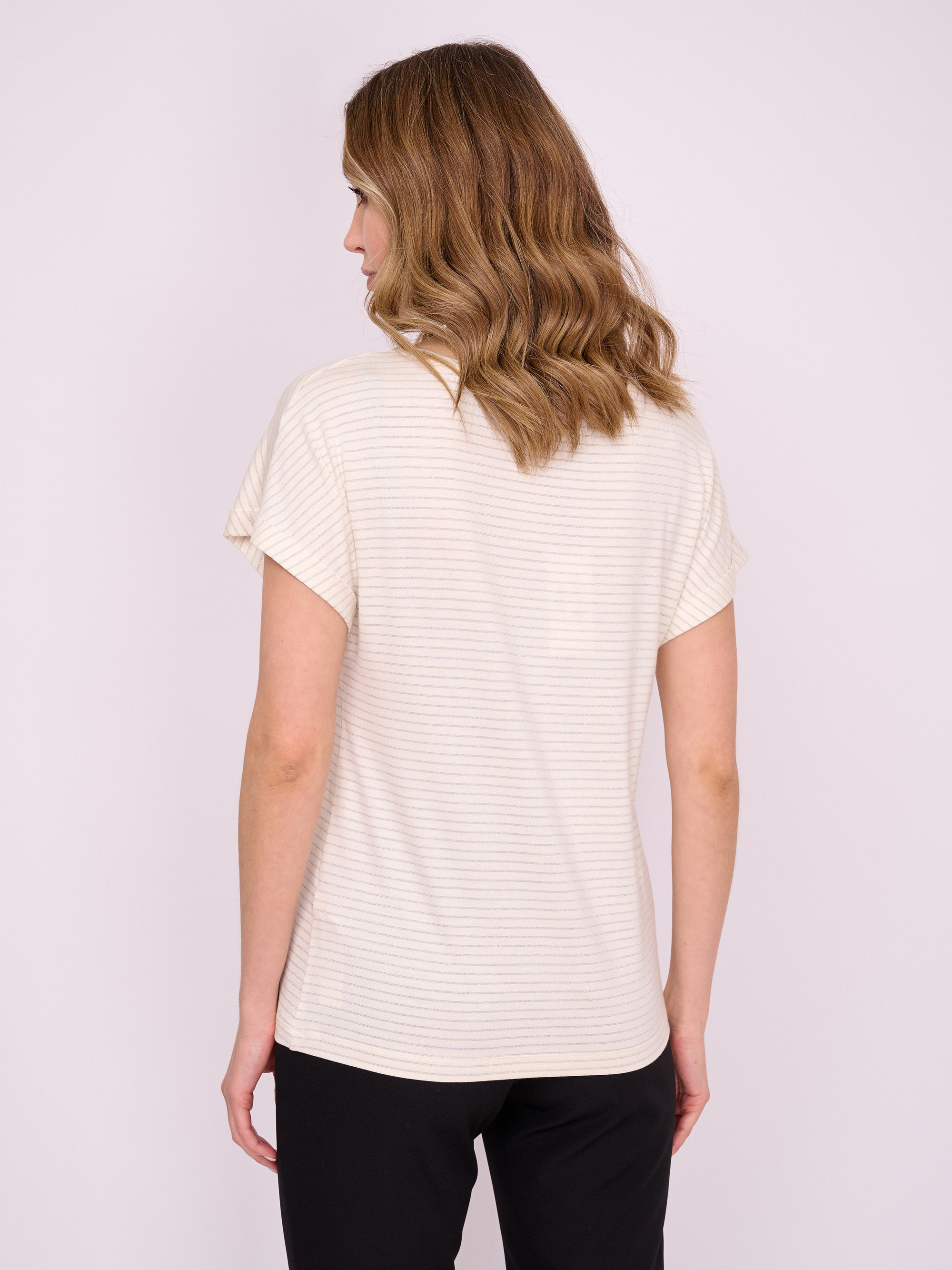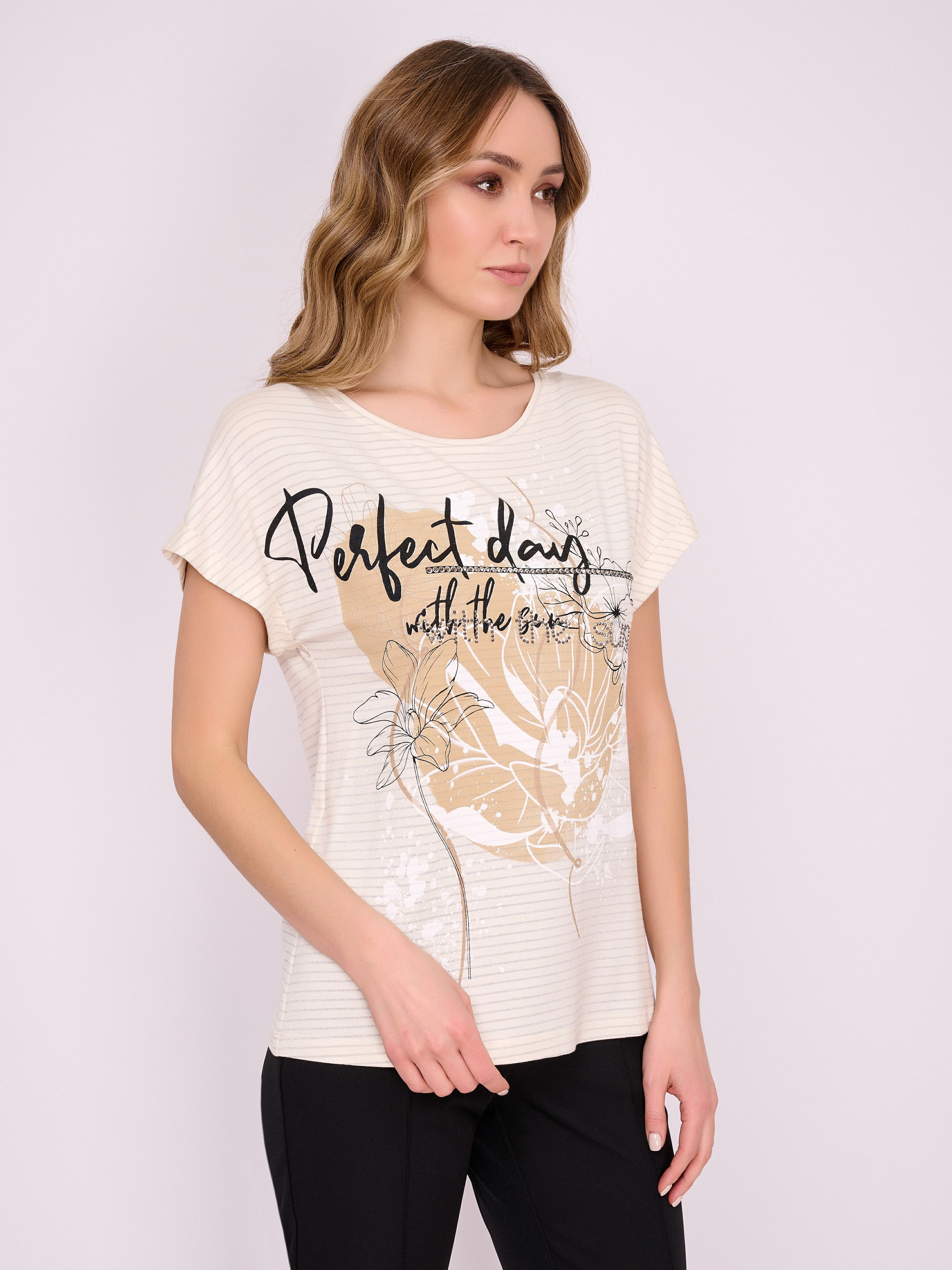 На сайте указаны российские размеры. Джемпер с короткими цельнокроеными рукавами и надписью на груди. Длина по спинке: 59 см. Рост модели 175 см.