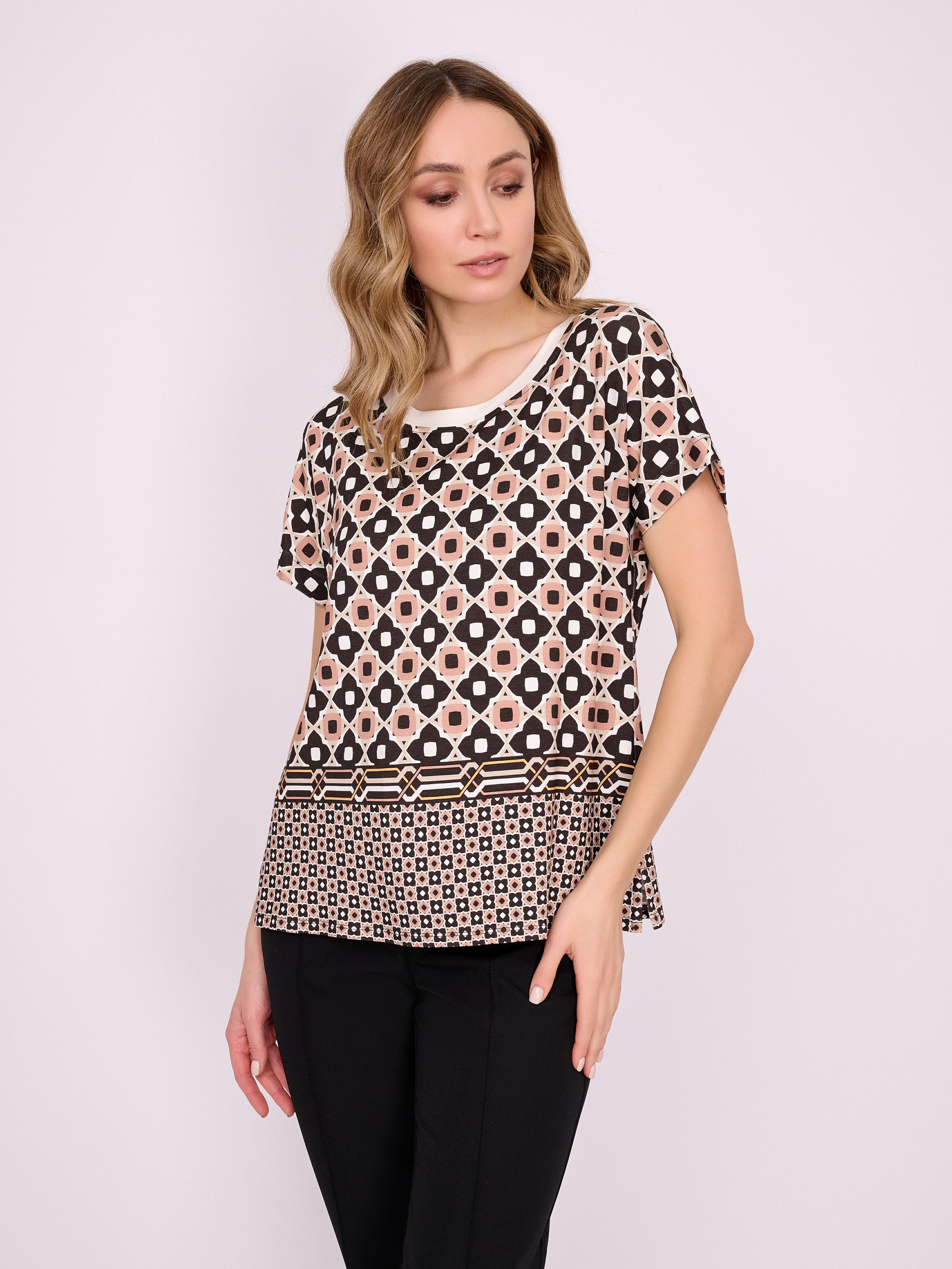 На сайте указаны российские размеры. Трикотажный джемпер свободного покроя с короткими цельнокроеными рукавами и боковыми разрезами. Длина по спинке: 49 см. Рост модели 175 см.