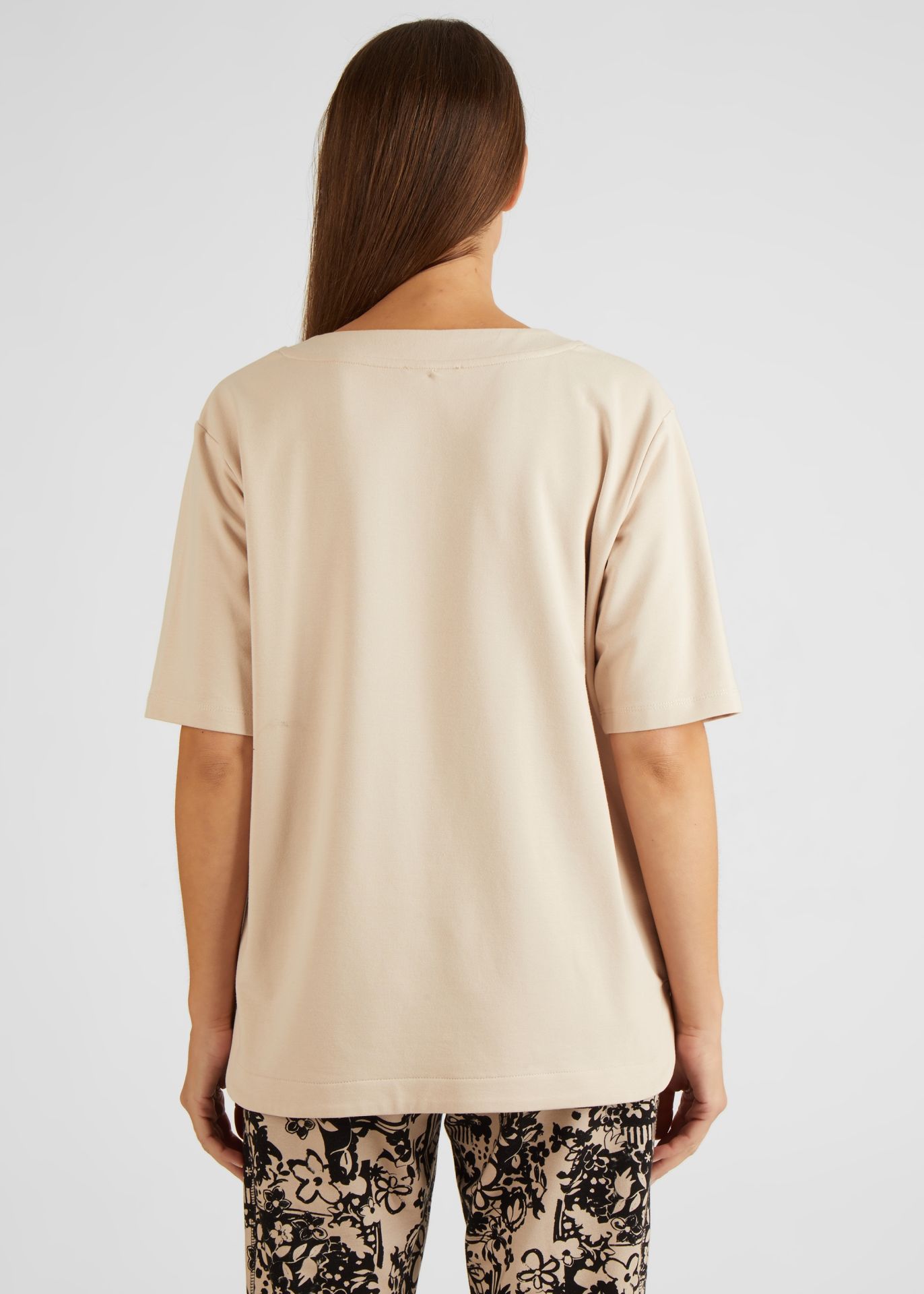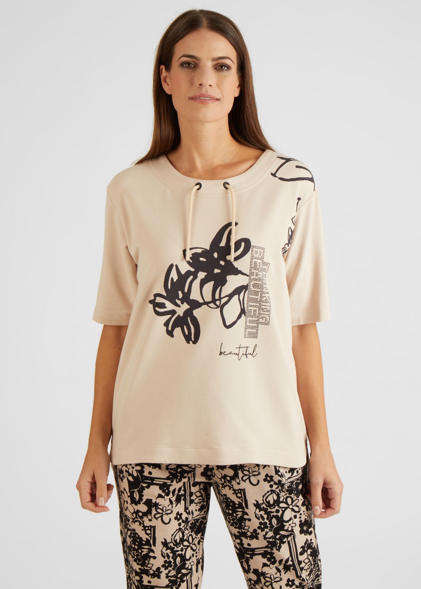 На сайте указаны российские размеры. Толстовка с незаметным воротником-стойкой украшена интересным принтом спереди и аппликацией из страз. Сочетание цветочного рисунка и надписей делает эту рубашку уникальной. Кулиска на воротнике придает этой толстовке непринужденный вид. Носите рубашку небрежно или элегантно с джинсами и модными кроссовками. Длина по спинке от плеча для размера 46: 68 см. Рост модели 176 см.