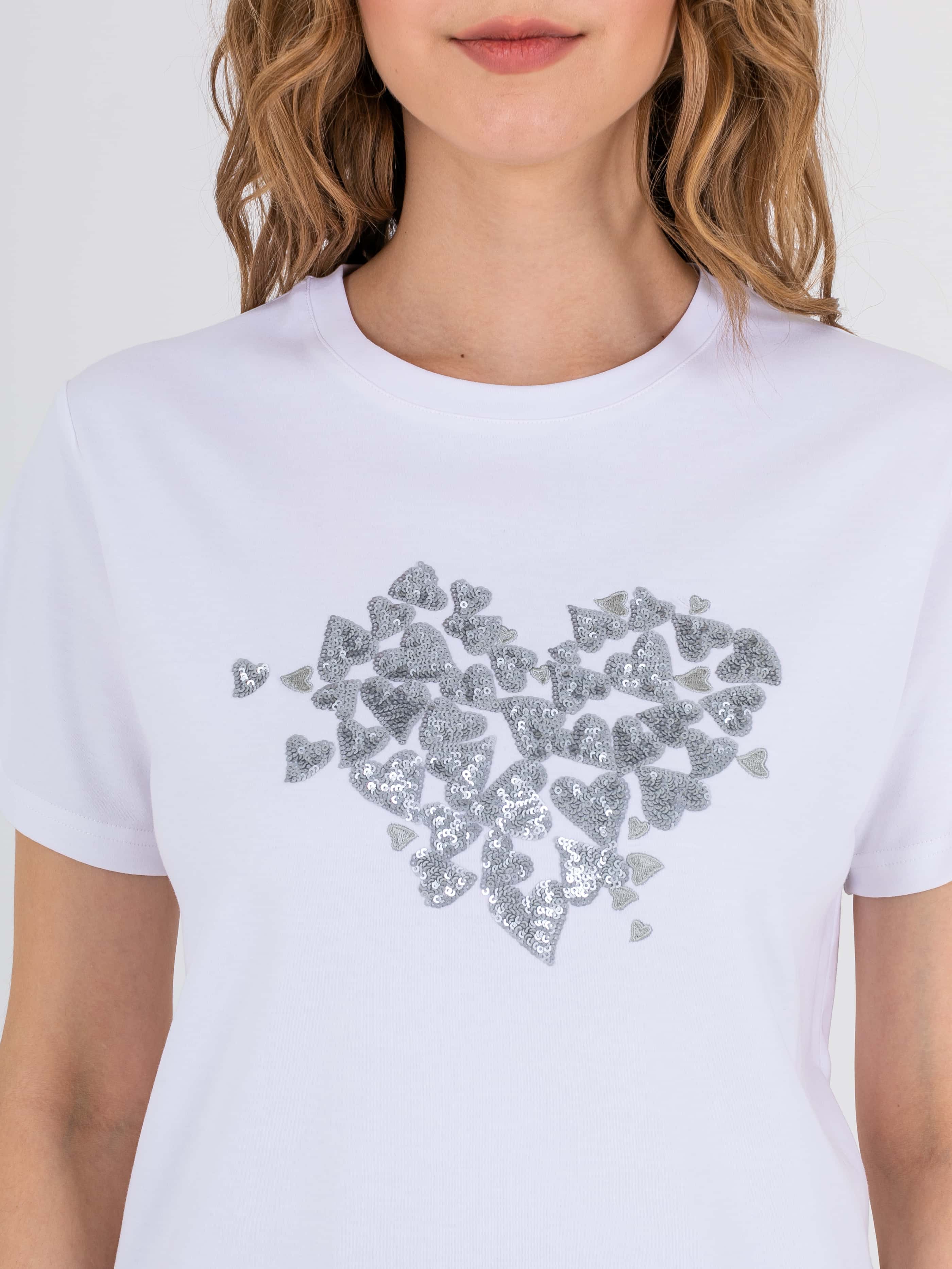 Футболка средней длины прямого силуэта из легкого хлопка. По переду выполнена нежная вышивка пайетками. Укороченные втачные рукава. Круглый вырез горловины.
