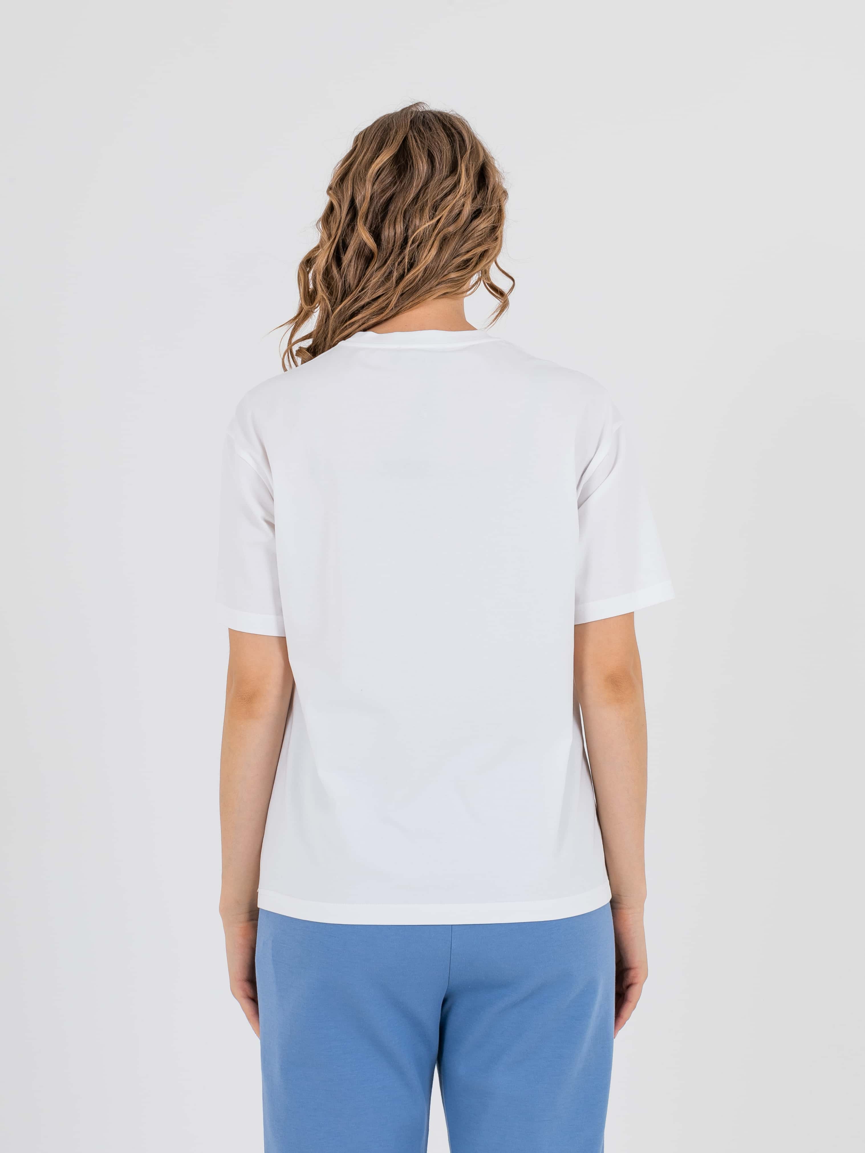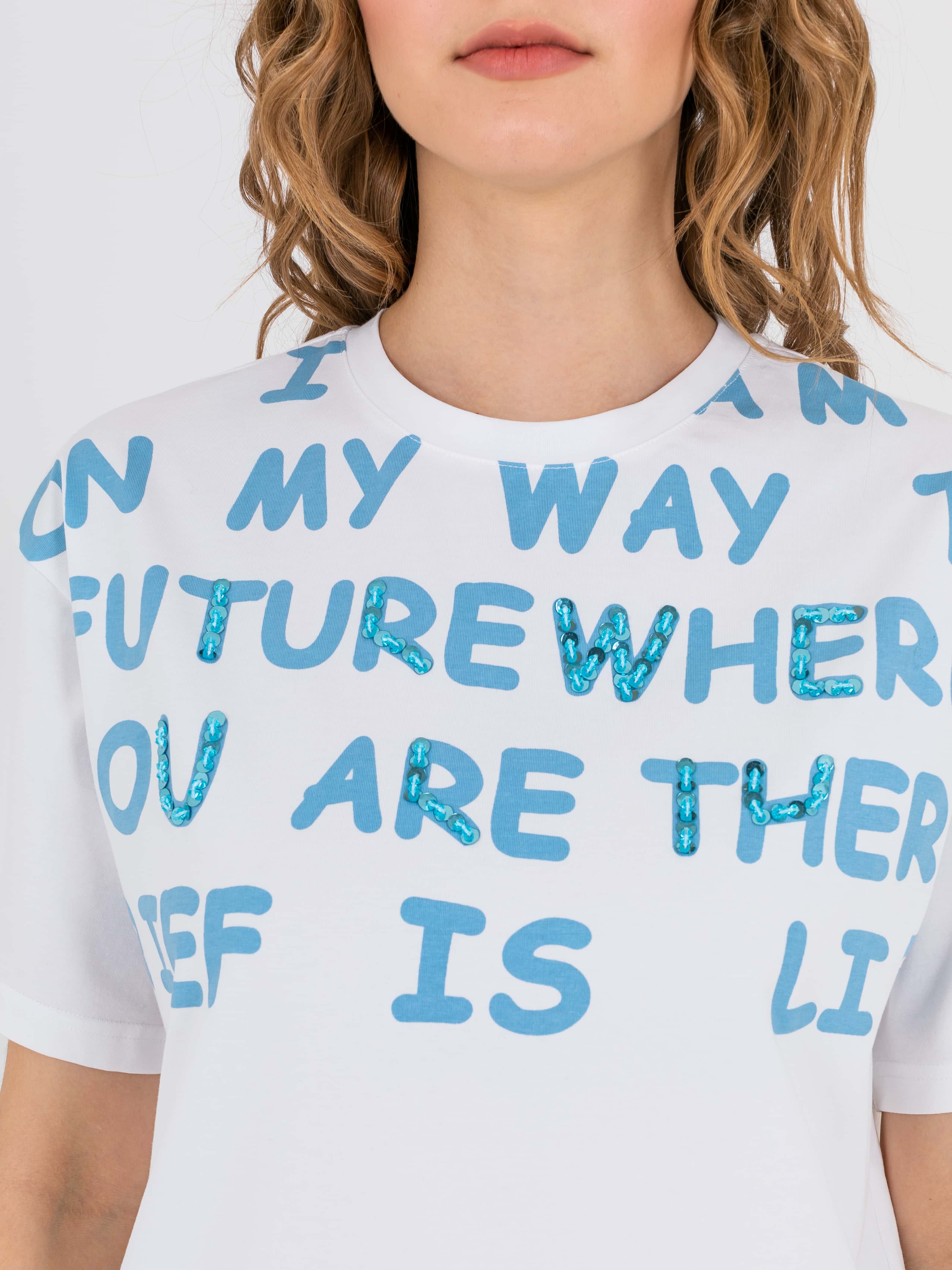 Футболка средней длины прямого силуэта из легкого хлопка с добавлением кукурузы. По переду выполнен яркий принт с вышивкой пайетками. Укороченные втачные рукава со спущенной линией плеча. Круглый вырез горловины.