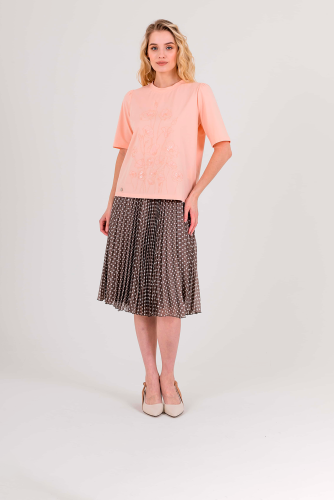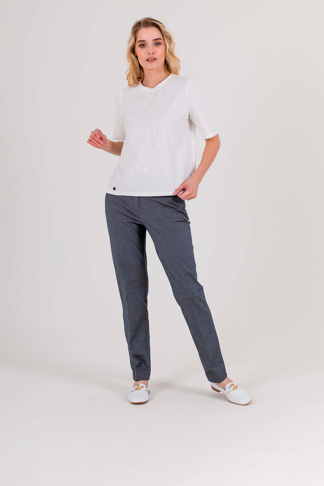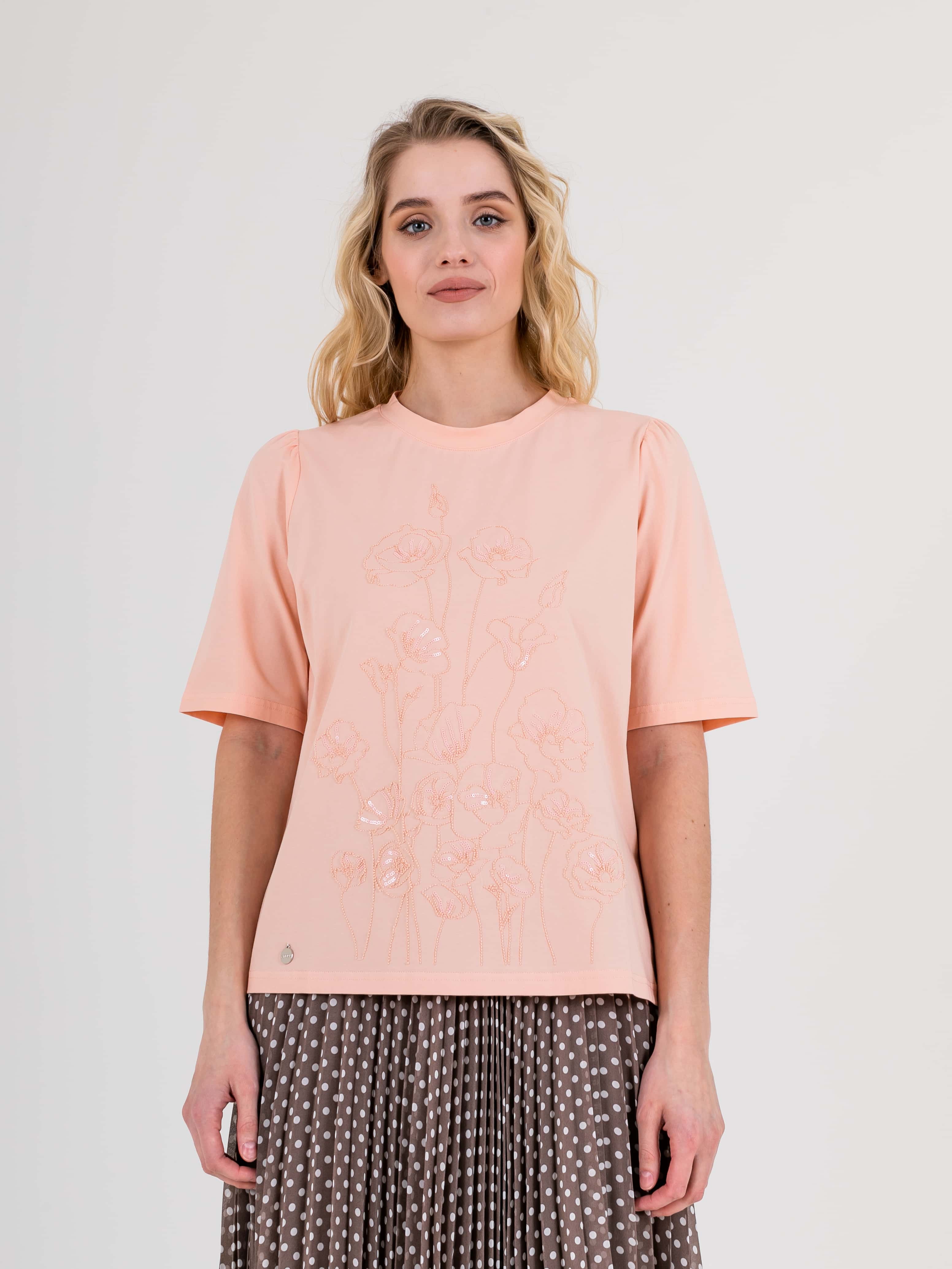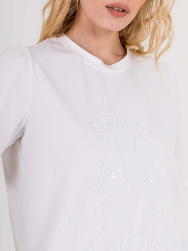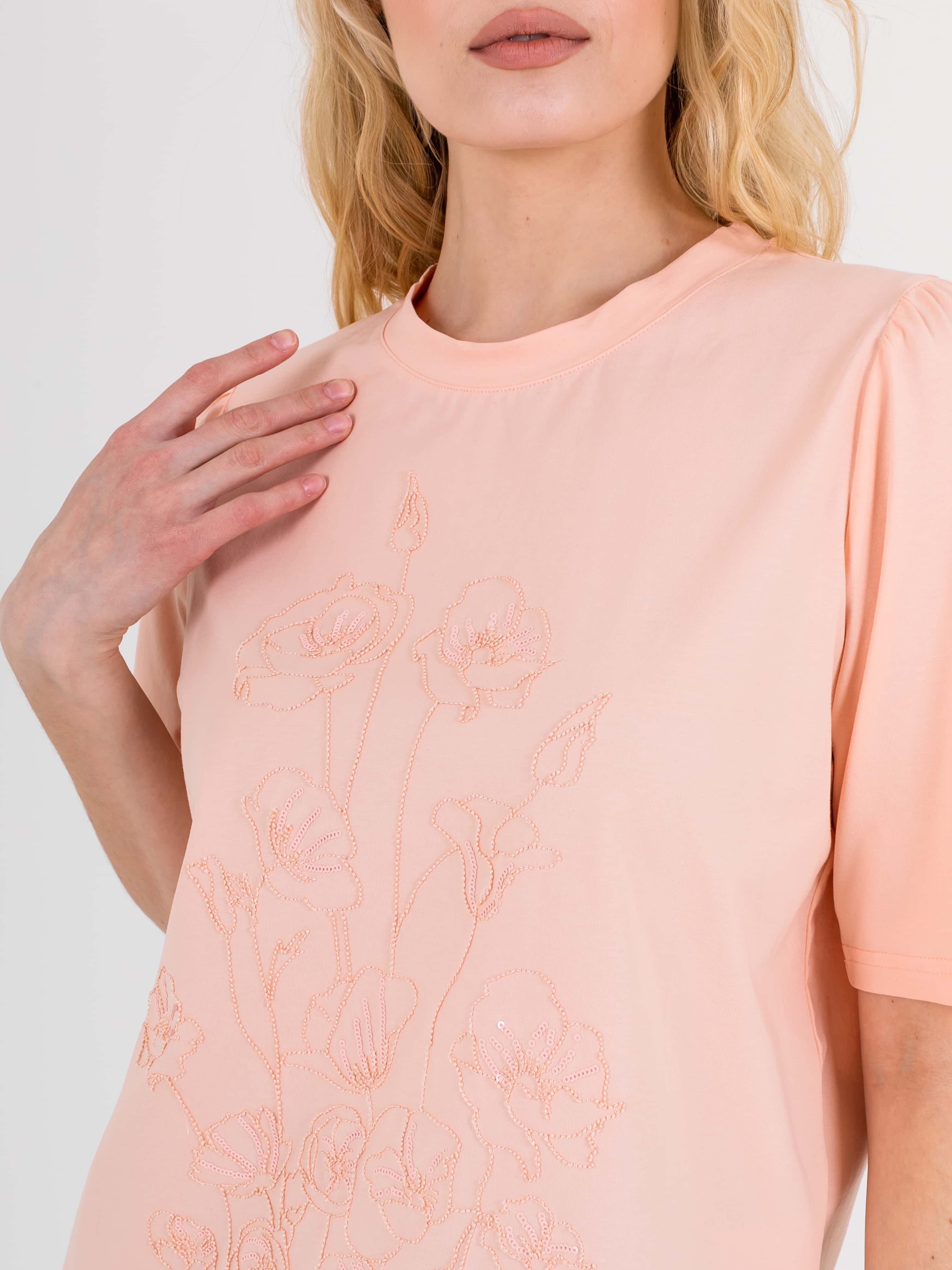 Укороченная футболка прямого силуэта из легкого хлопка с добавлением спандекса. По переду выполнена нежная вышивка. Укороченные втачные рукава с небольшой сборкой по пройме. Круглый вырез горловины.