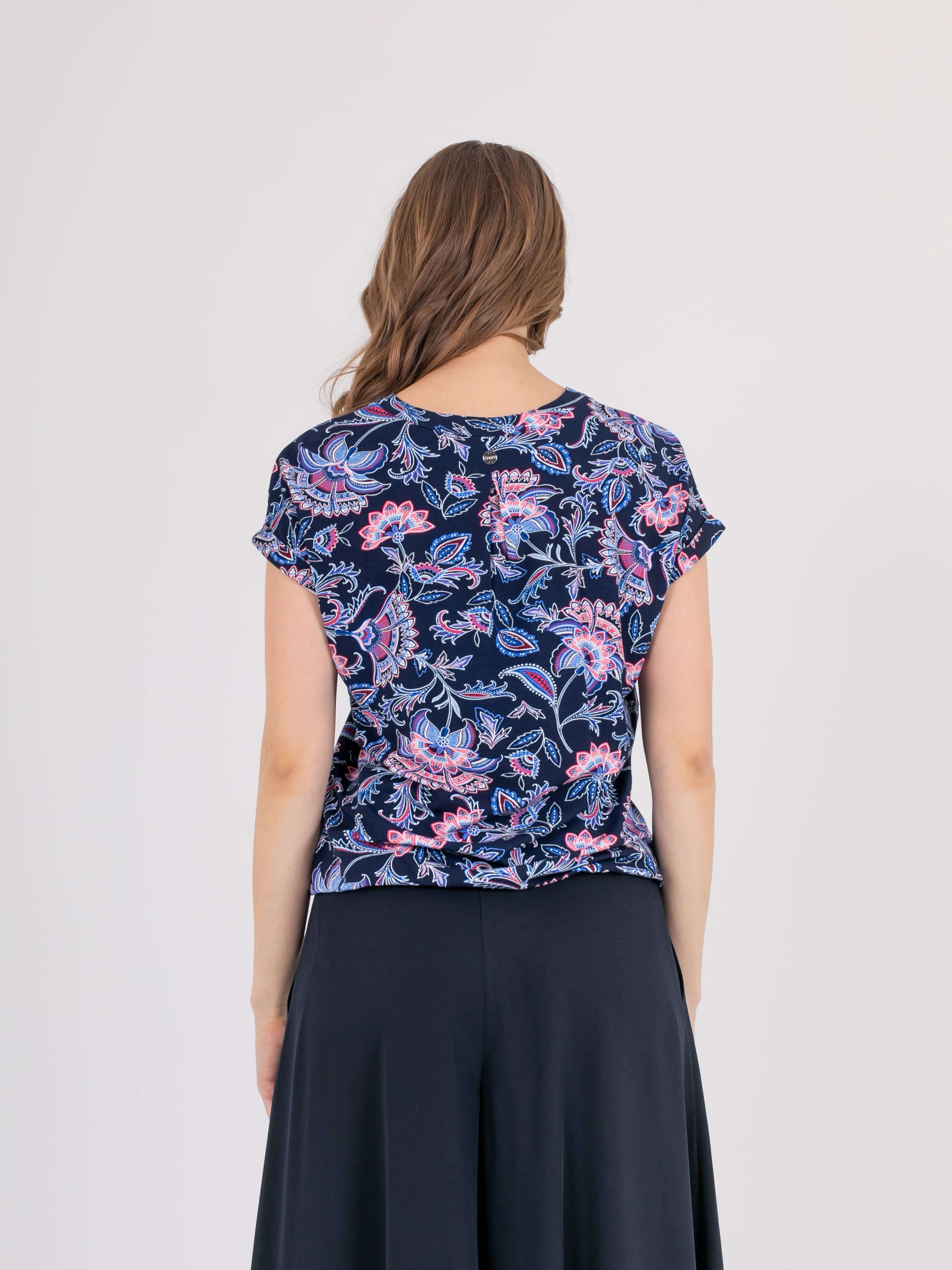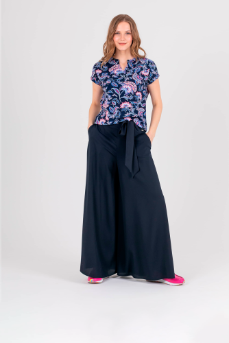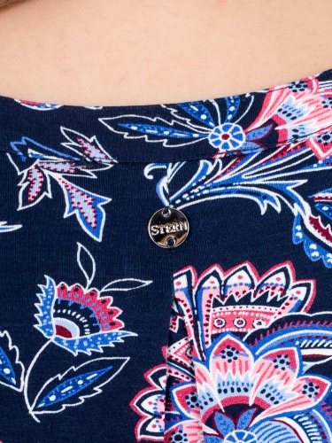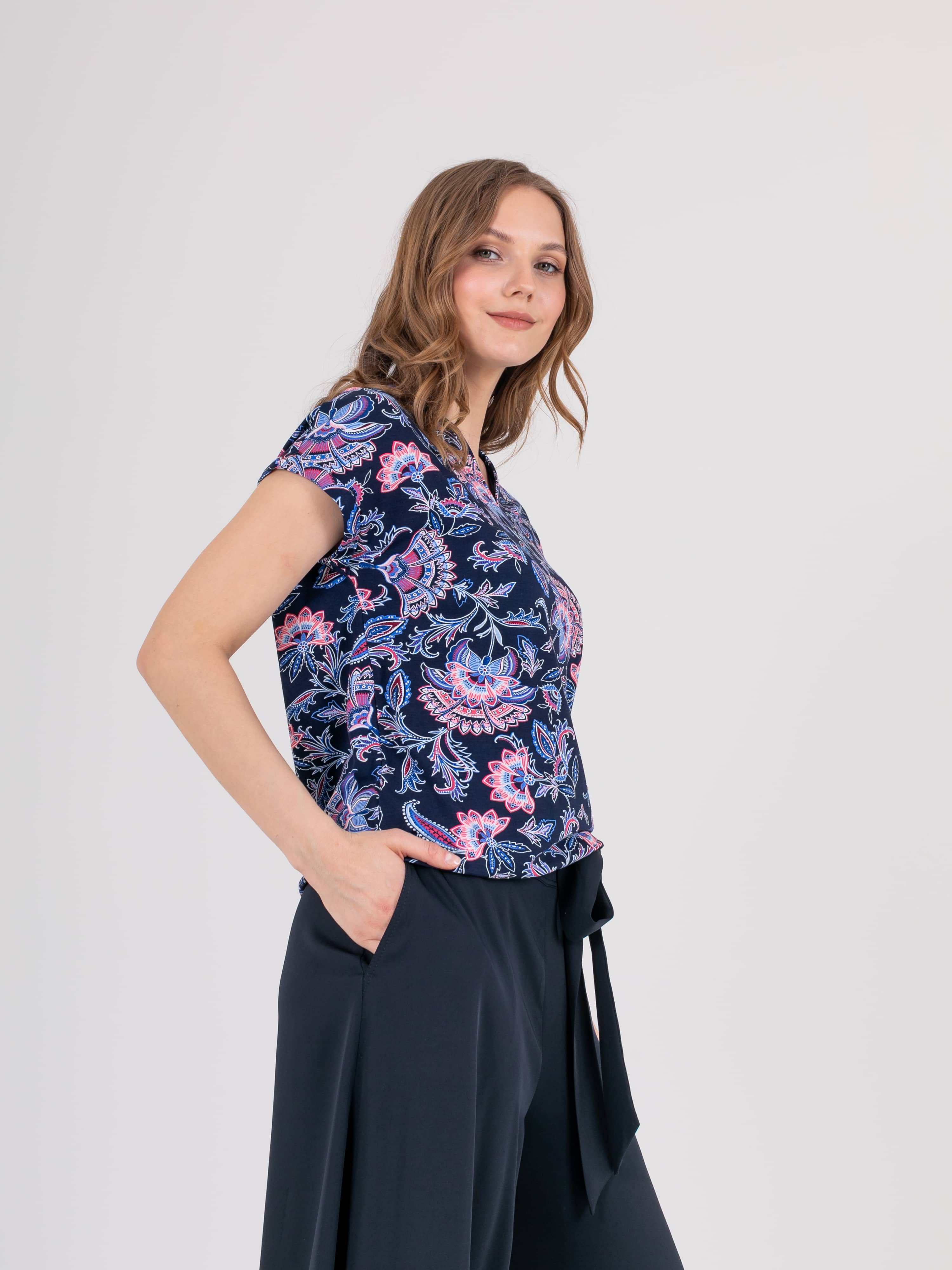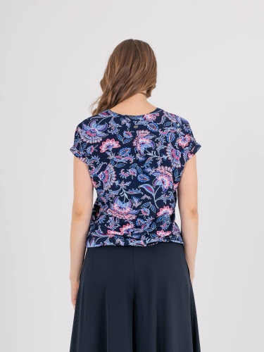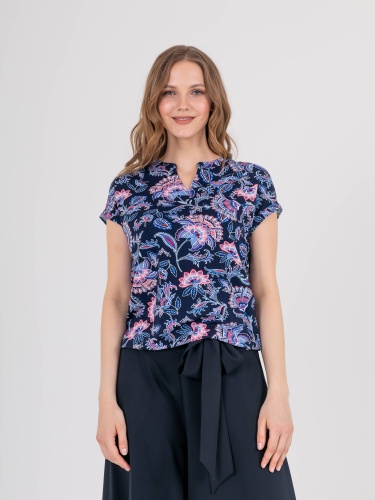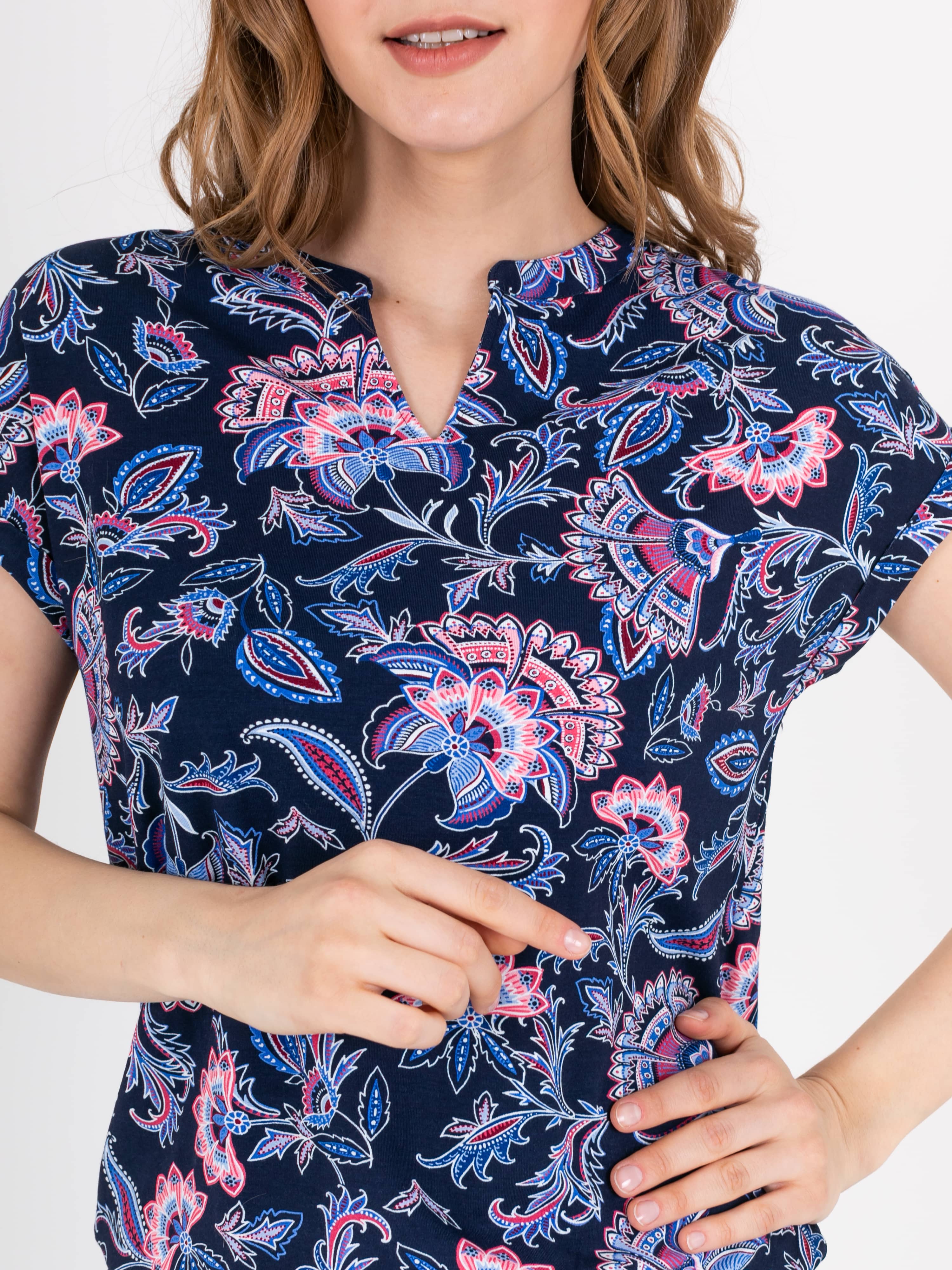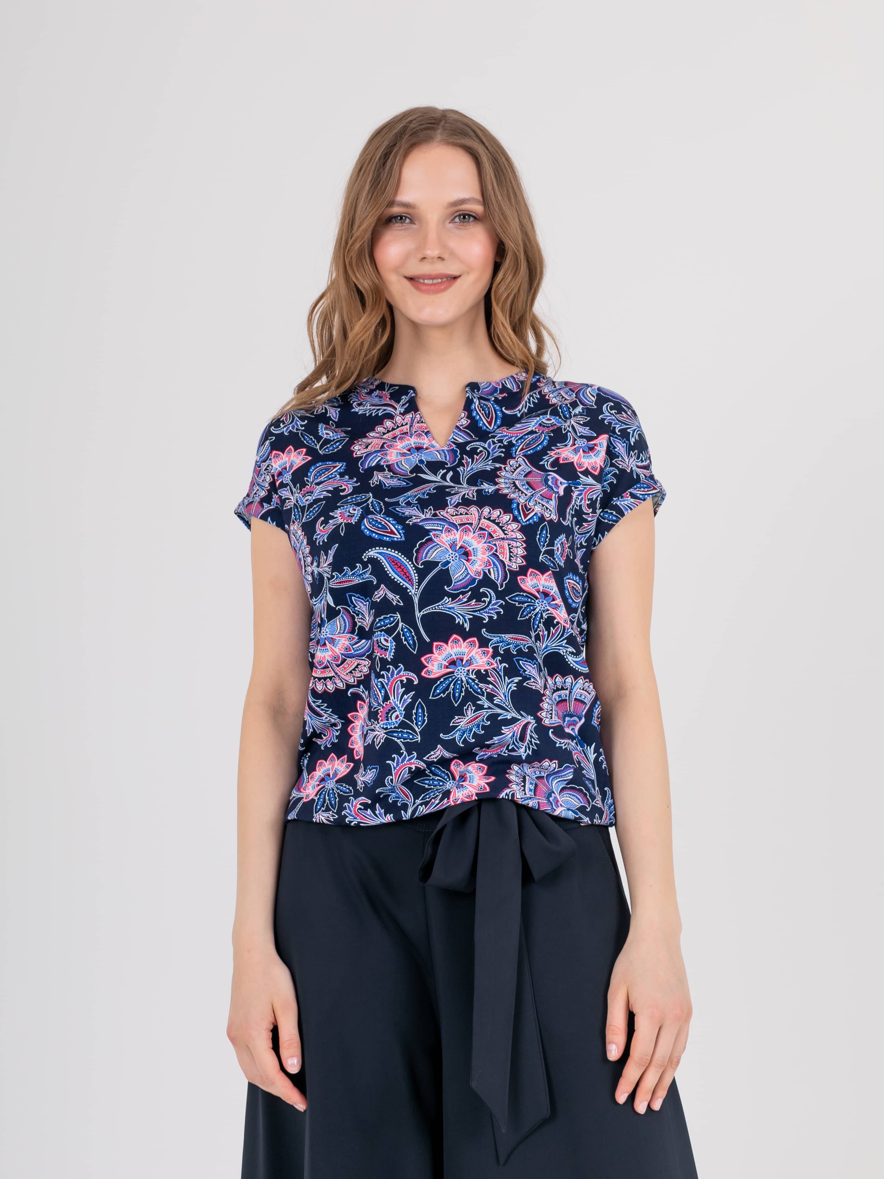 Футболка средней длины прямого силуэта из легкой, мягкой вискозы с добавлением эластана, дизайнерская особенность модели – эффектный флористический принт. Короткие цельнокроеные рукава с манжетами. Круглый вырез горловины с разрезом, обработан косой бейкой.