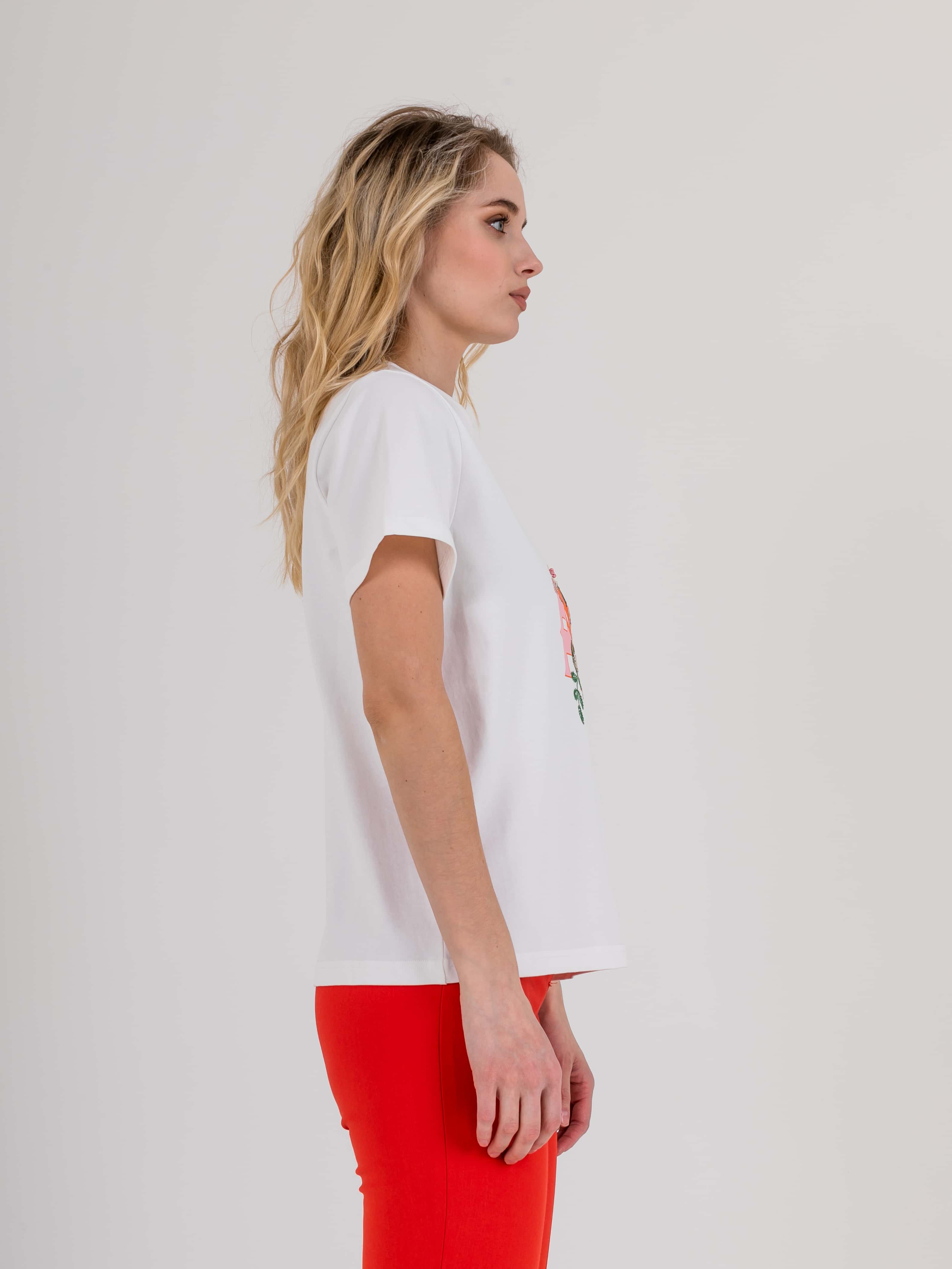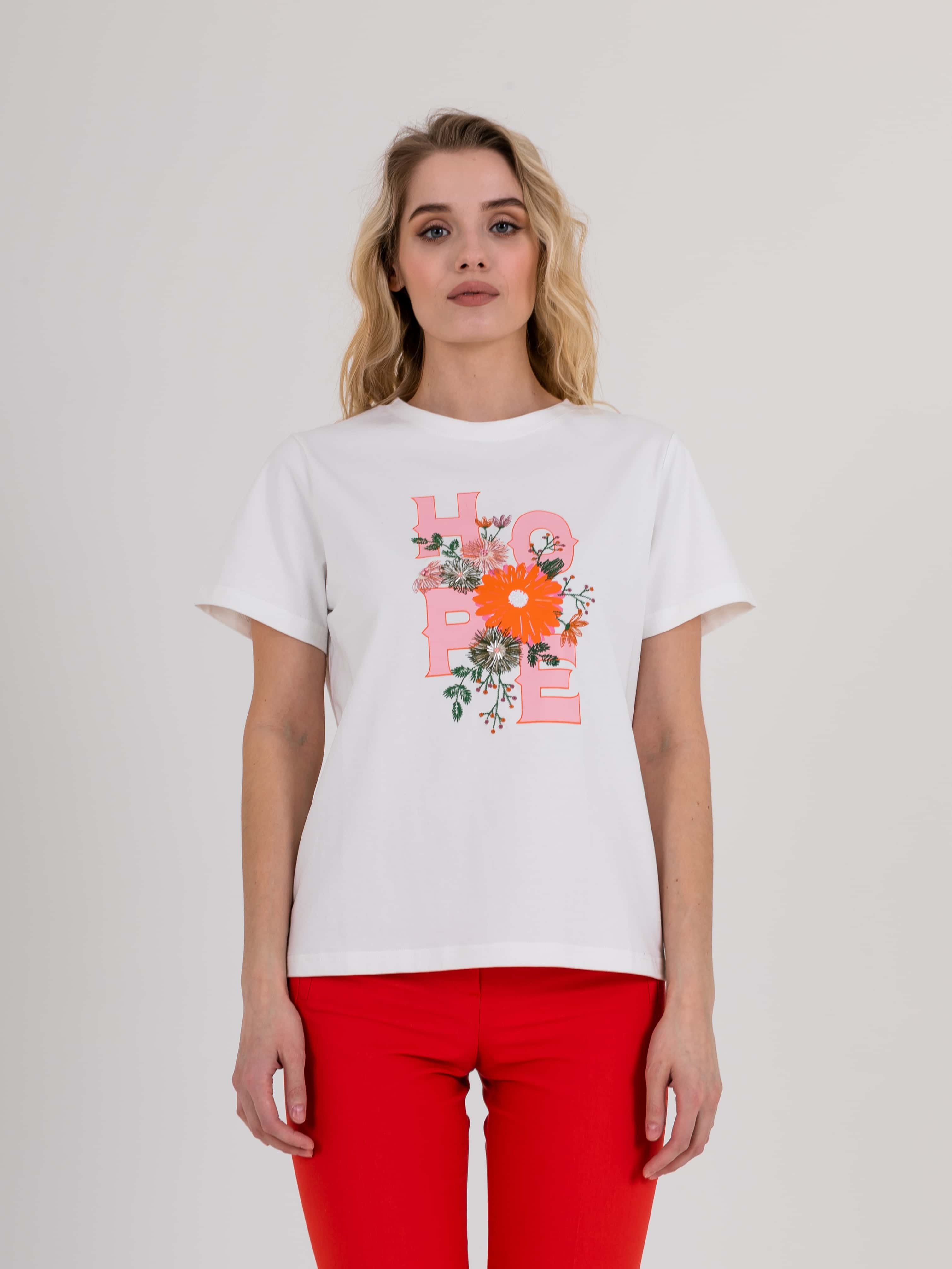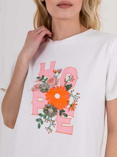 Футболка средней длины прямого силуэта из легкого 100% хлопка. По переду выполнен яркий принт с растительной вышивкой. Укороченные втачные рукава. Круглый вырез горловины.