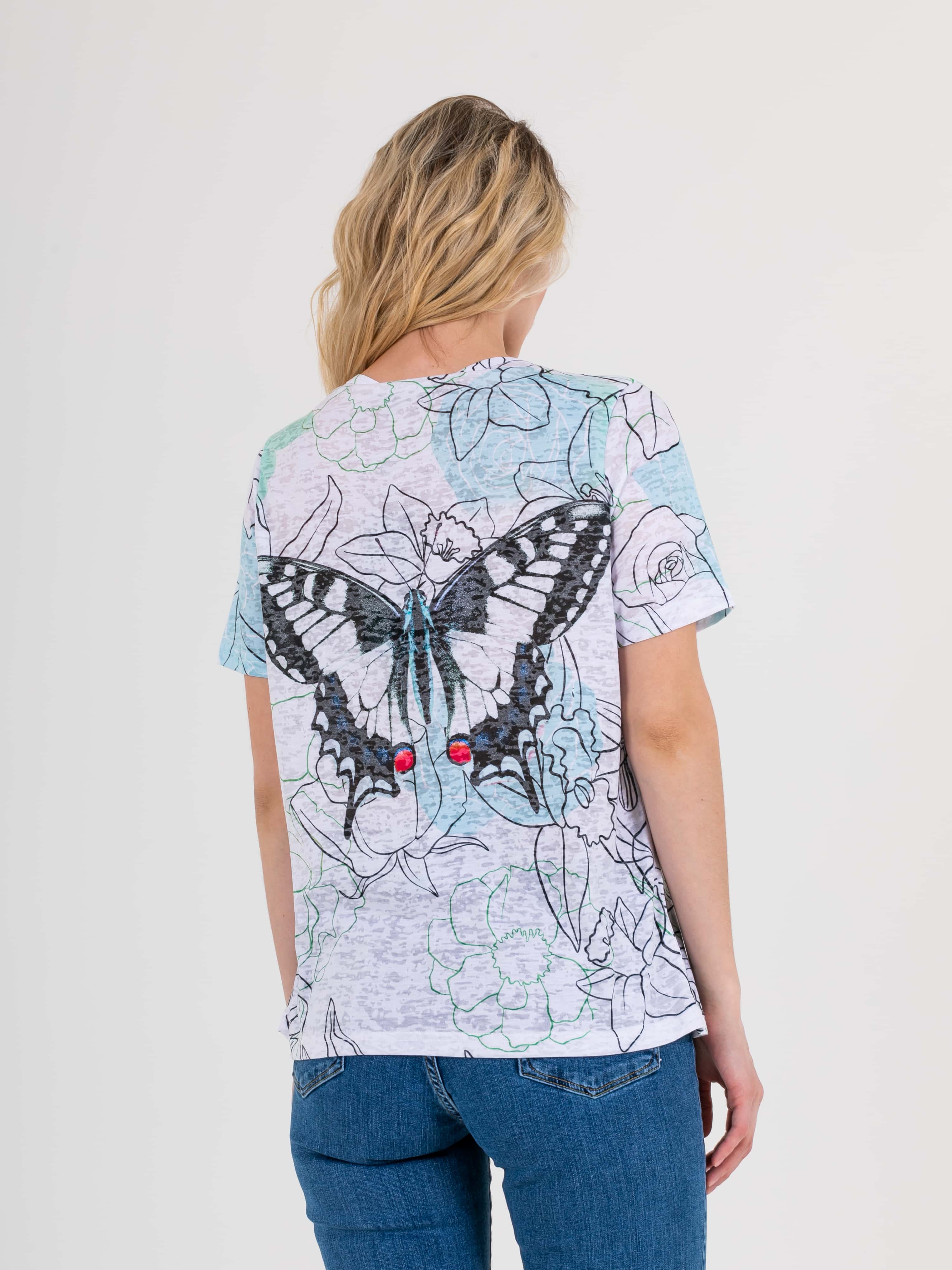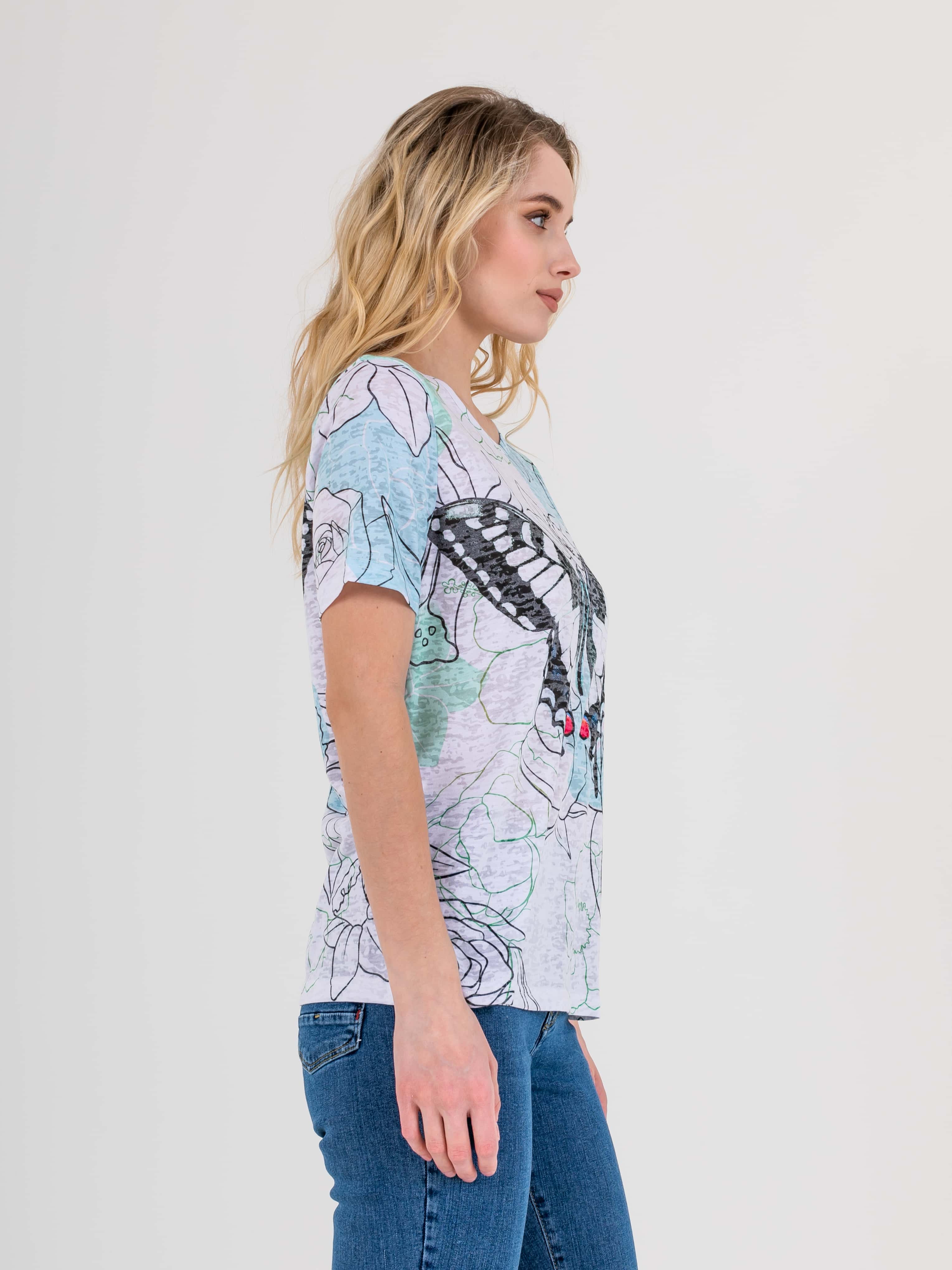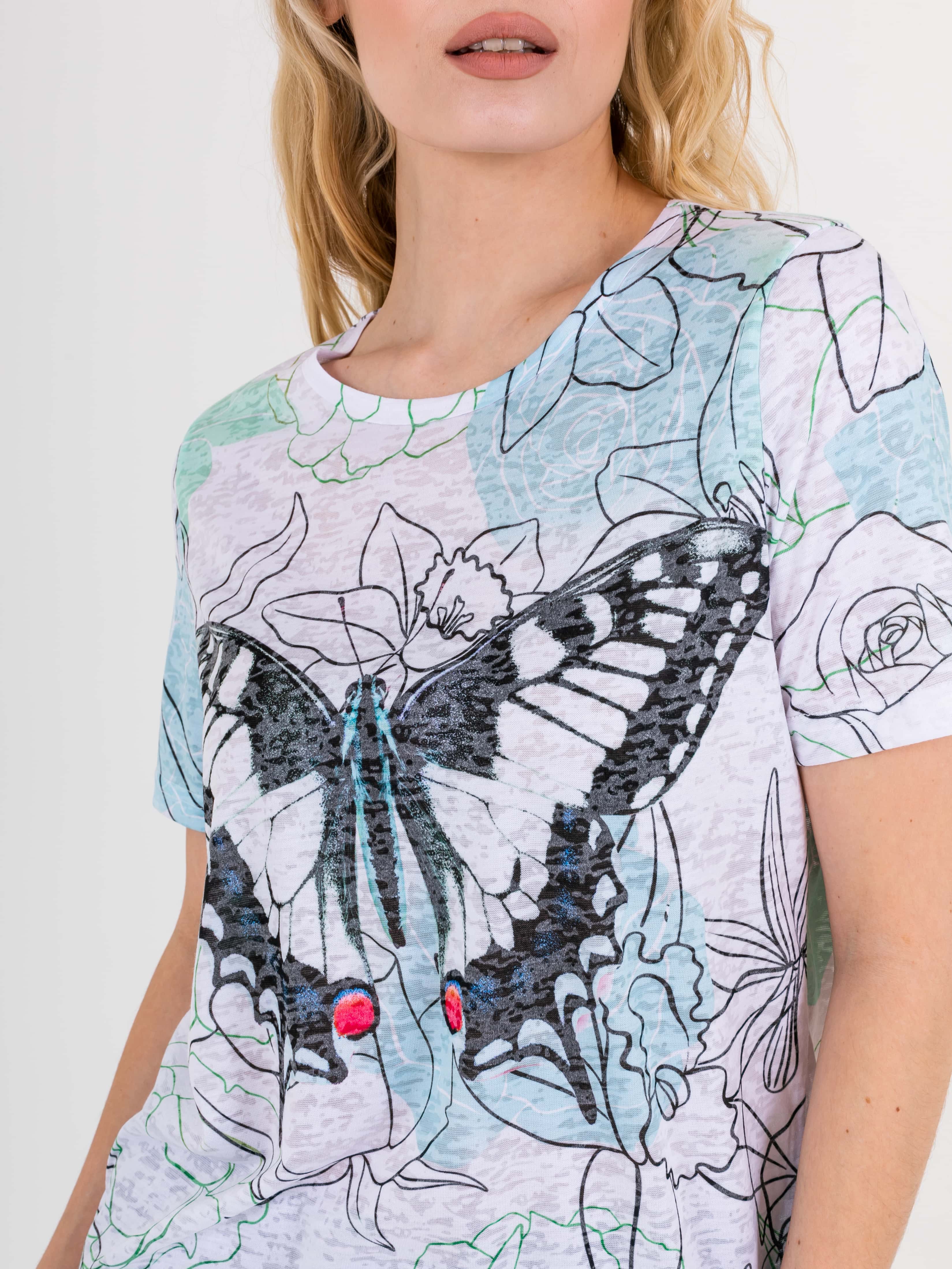 Футболка средней длины прямого силуэта из полиэстера с добавлением мягкой вискозы, дизайнерская особенность модели – нежный флористический принт и фактурный трикотаж. Укороченные втачные рукава. Круглый вырез горловины.