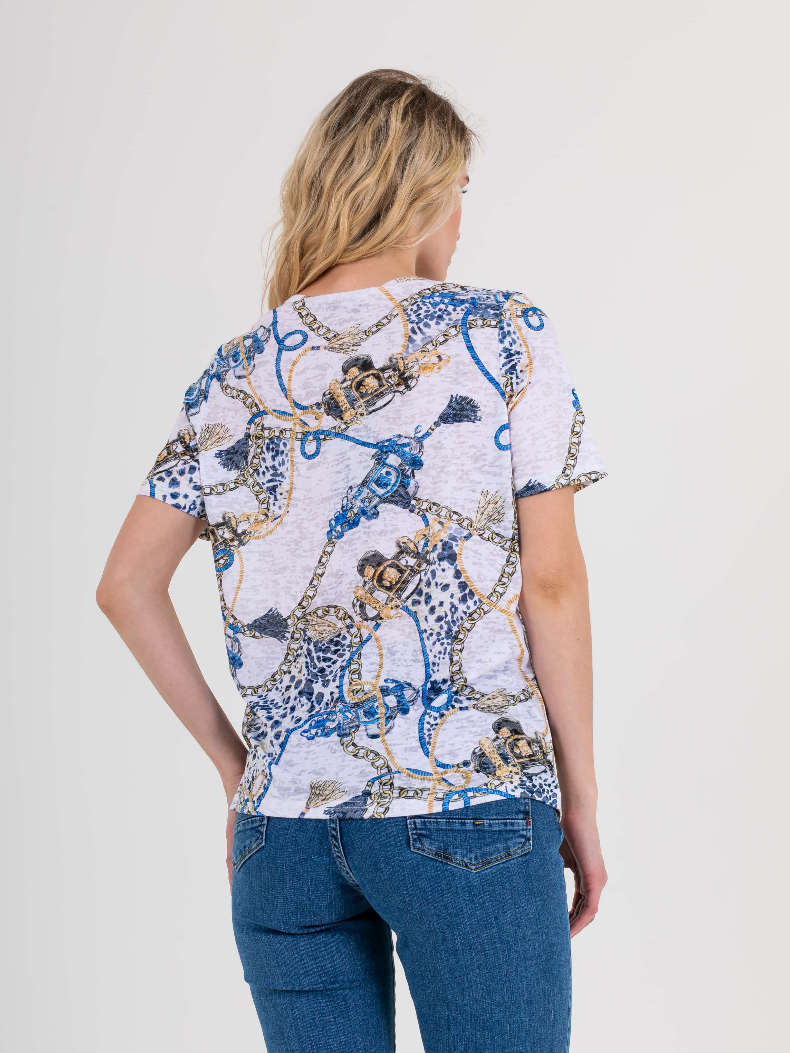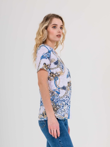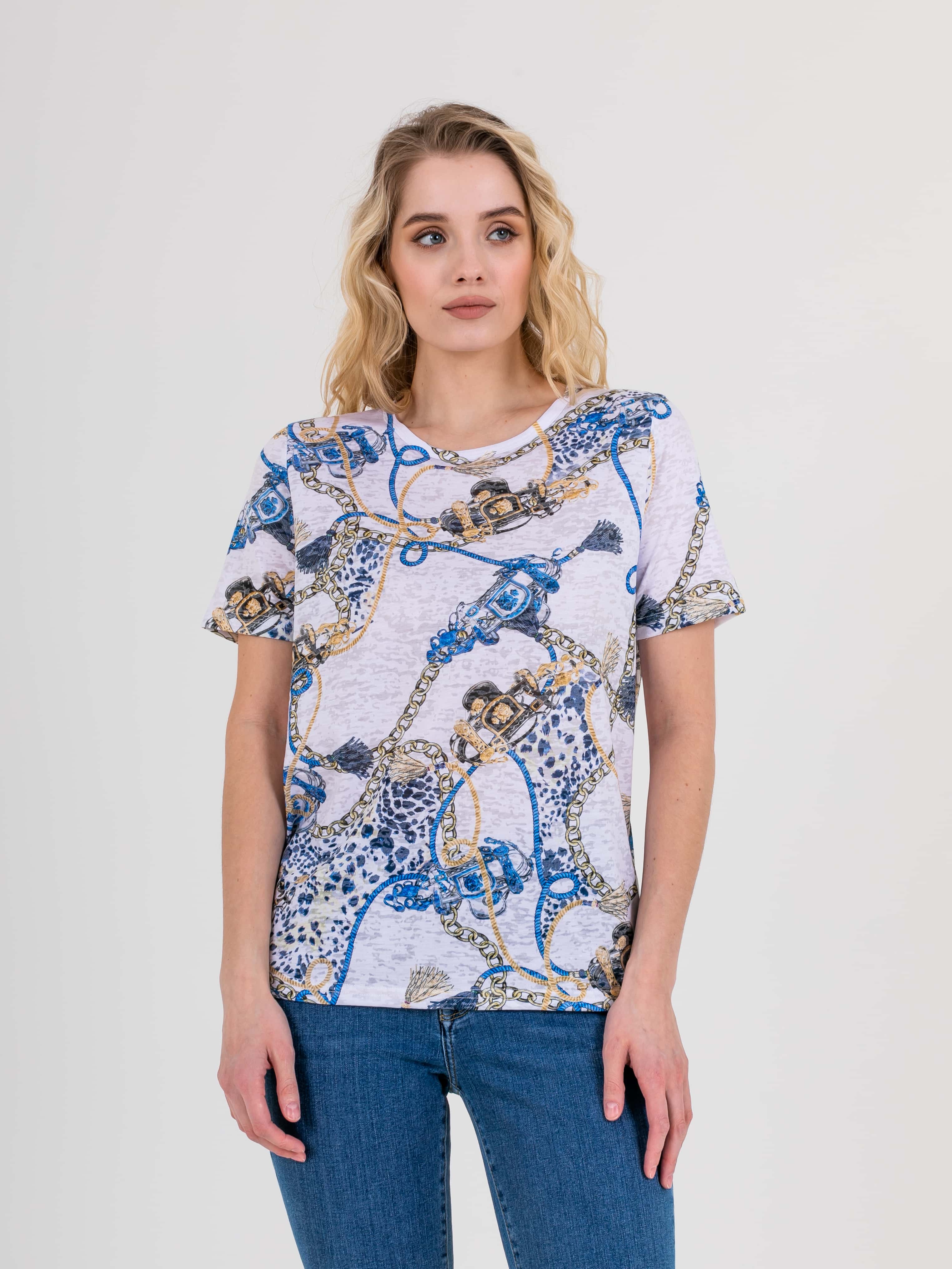 Футболка средней длины прямого силуэта из полиэстера с добавлением мягкой вискозы, дизайнерская особенность модели – эффектный принт и фактурный трикотаж. Укороченные втачные рукава. Круглый вырез горловины.