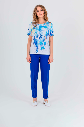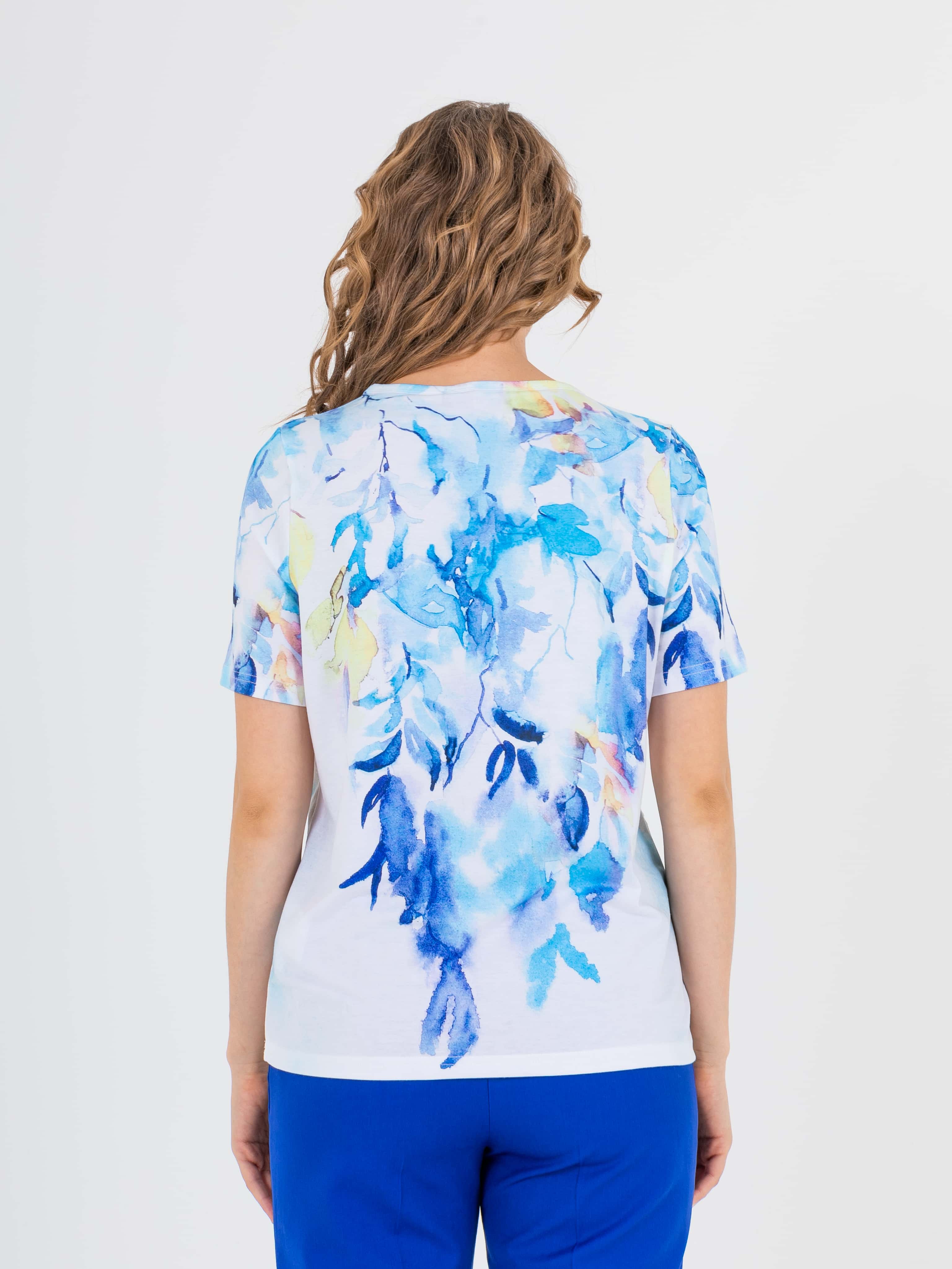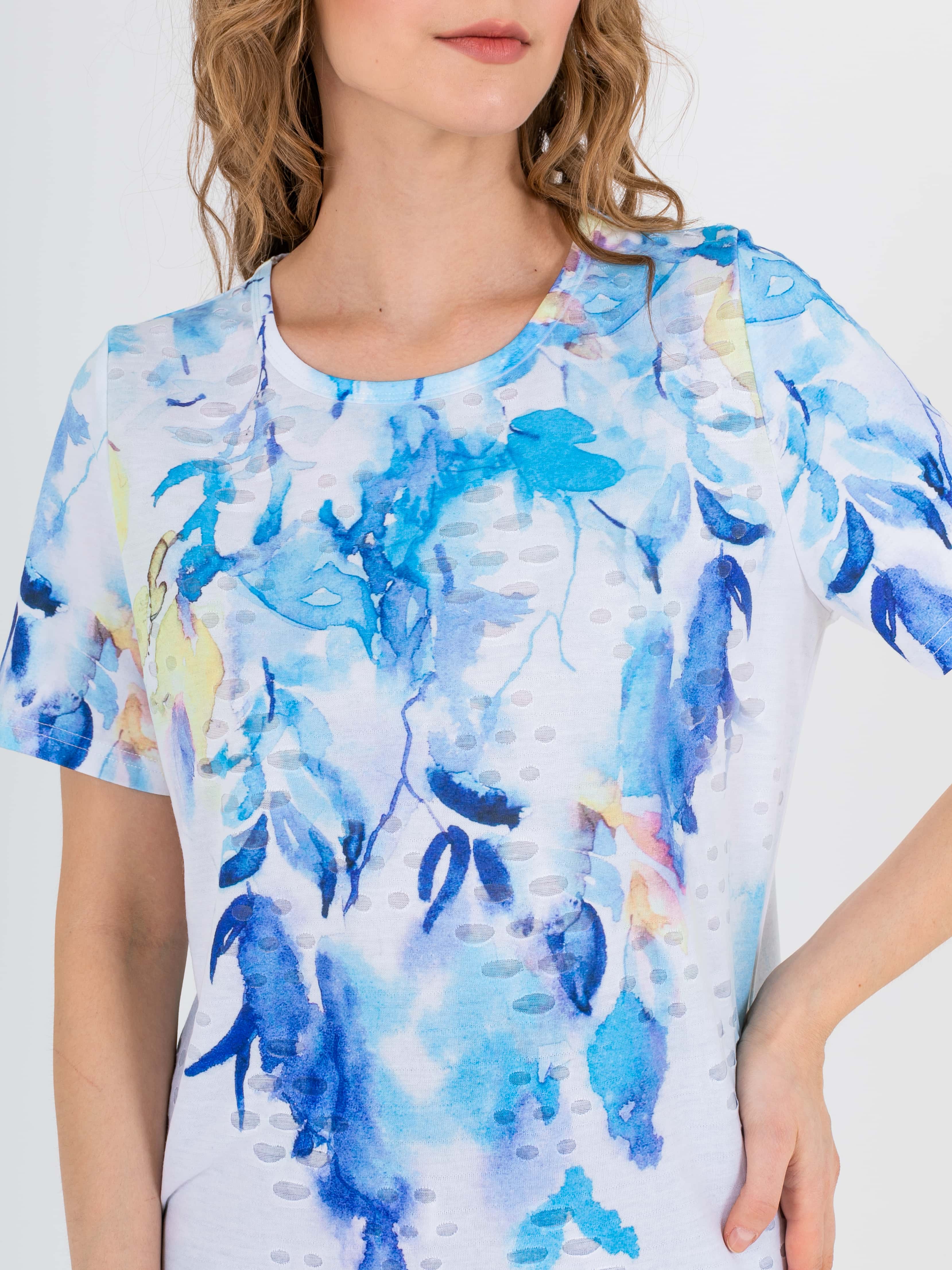 Футболка средней длины прямого силуэта из полиэстера с добавлением эластана, дизайнерская особенность модели – нежный растительный принт. Перед выполнен из фактурного трикотажа. Укороченные втачные рукава. Круглый вырез горловины.
