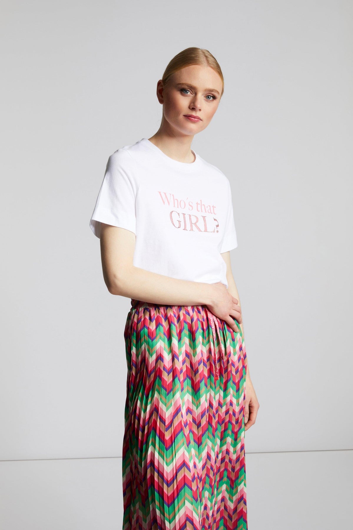 Привлекательным элементом этой футболки из органического хлопка является размещенный принт с надписью «Кто эта девушка». Это также обеспечивается каймой со стразами. В остальном свободный крой верха характерен для рубашки с круглым вырезом, рукавом в четверть и небольшими боковыми разрезами. Длина в размере 42: 61см