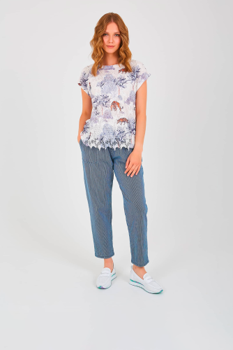 Двухслойная футболка средней длины прямого силуэта из полиэстера с добавлением мягкой вискозы, дизайнерская особенность модели – принт в восточном стиле и фактурный трикотаж. Перед выполнен из нежного шитья с бабочками и вставками из трикотажа. Короткие цельнокроеные рукава с манжетами. Круглый вырез горловины.