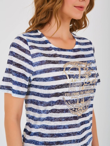 Футболка средней длины прямого силуэта из полиэстера с добавлением мягкой вискозы, дизайнерская особенность модели – принт в полоску и фактурный трикотаж. По переду выполнен яркий морской принт. Укороченные втачные рукава. Круглый вырез горловины.