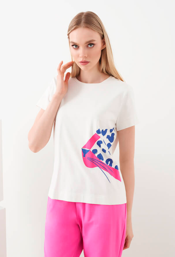 Футболка прямого силуэта, выполнена из трикотажного полотна. Овальный вырез горловины. Короткие притачные рукава. Спереди выполнен дизайнерский принт «Гепард» с фольгированным эффектом.