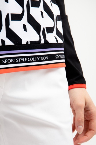 Повседневная рубашку-поло с длинными рукавами. Классический вязаный воротник имеет контрастную полоску по краю и заканчивается короткой молнией, гарантирующей комфортное одевание. Передняя часть с эксклюзивным графическим принтом со встроенными логотипами Sportalm привлекает всеобщее внимание. Рукава отделаны эластичной резинкой, а по низу имеется полосатая вышивка на манжете с надписью Sportalm. Классическую этикетку сзади заменяет принт из фольги.