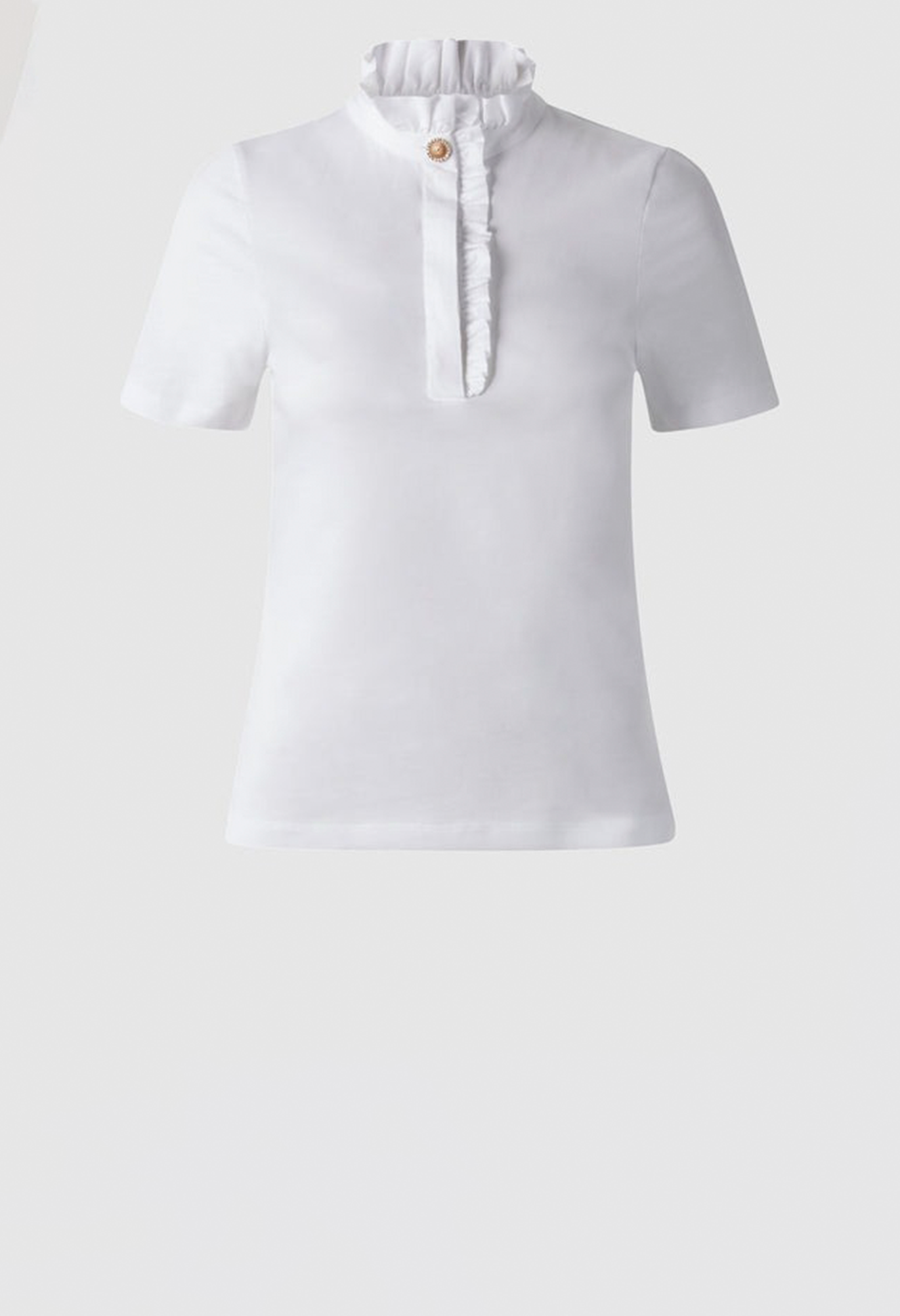 Футболка изготовлена из экологически чистого материала, имеет планку на пуговицах с рюшами и воротник с оборками из тканого хлопка. Трикотажный материал облегает фигуру. Длина для размера 42: 58 см. Окружность груди для размера 42: 82 см.