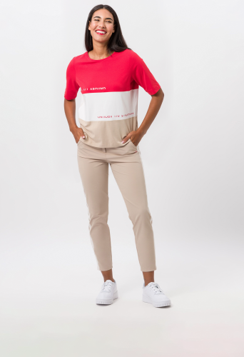 Футболка с неброским текстовым принтом. Цветовые блоки и умело размещенные принты создают привлекательный эффект этой классной базовой модели. Футболка также выигрывает при ношении благодаря приятным свойствам мягкого эластичного трикотажа из хлопка и модала, а также облегающему фигуру и очень популярному свободному крою. Верх выполнен в виде классической футболки с круглым вырезом и рукавами полудлины.