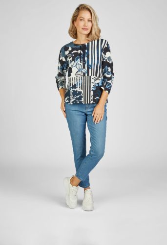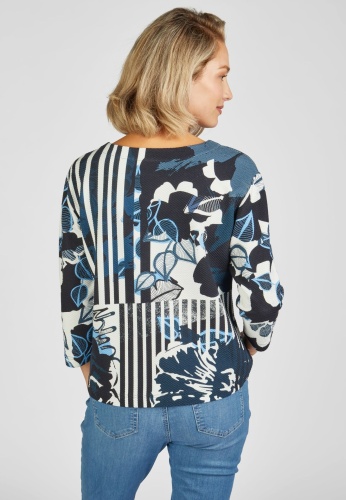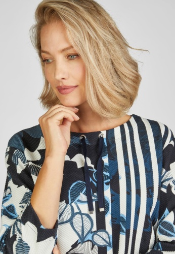 Джемпер с круглым вырезом, рукавами 3/4 и заниженной линией плеча придают этой модели непринужденную элегантность. Уникальный узор сочетает в себе цветочные и полосатые мотивы, а голубые детали добавляют свежий акцент. Завязки на вырезе придают толстовке игривый вид. Длина спинки от плеча для 44 размера: 62 см.