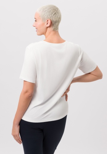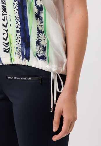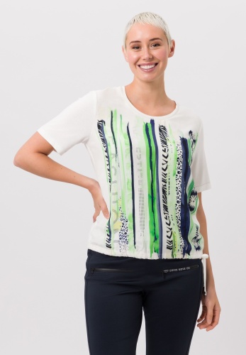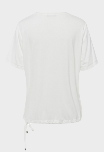 Футболка женская с эффектом металлик. Тканый материал спереди украшен ярким дизайнерским принтом с металлическими эффектами. Оверлочные швы также имеют металлический отлив, а ширину кромки кефали можно варьировать в зависимости от настроения с помощью кулиски. Длина для размера 42 - 60 см.
