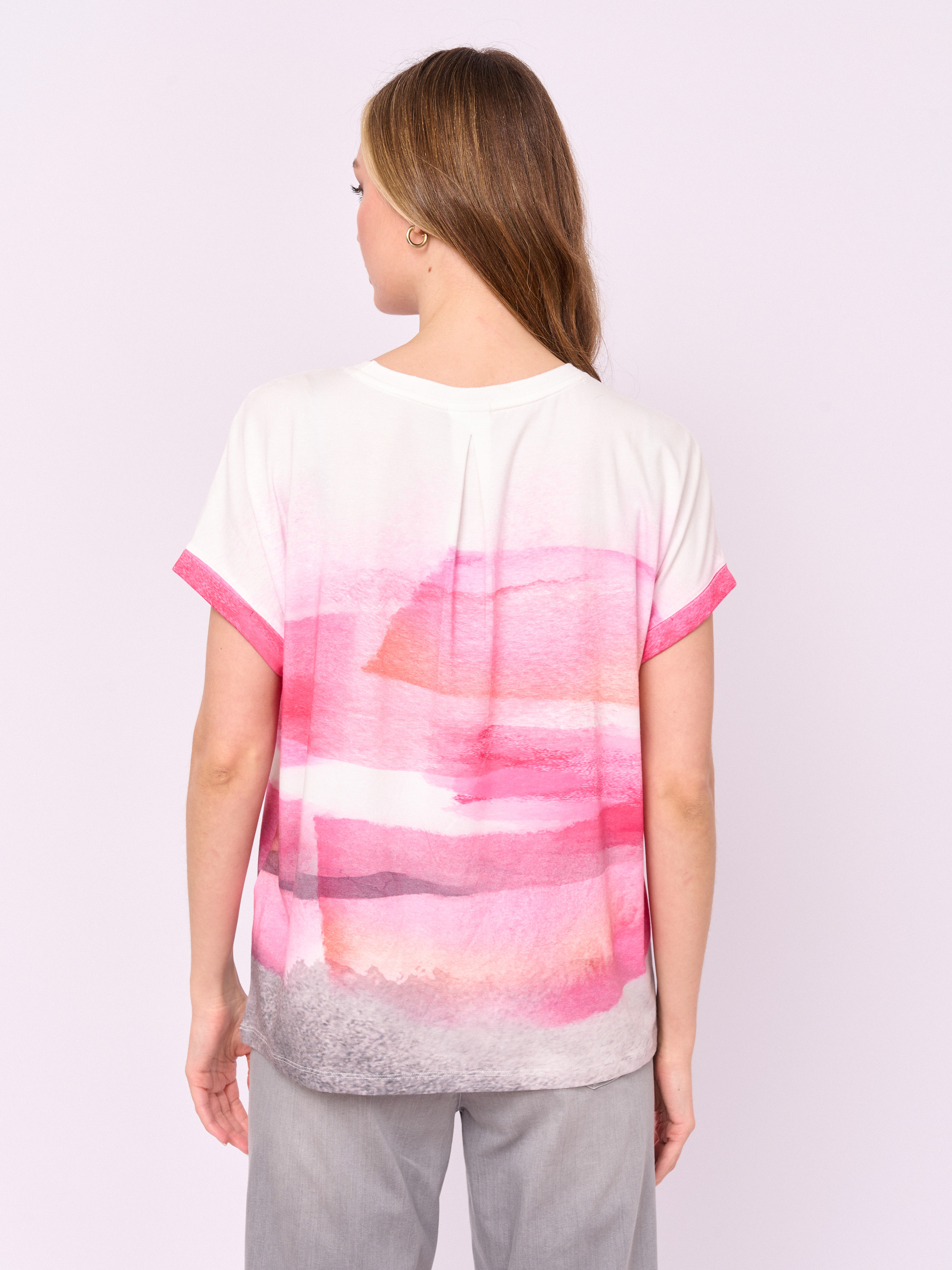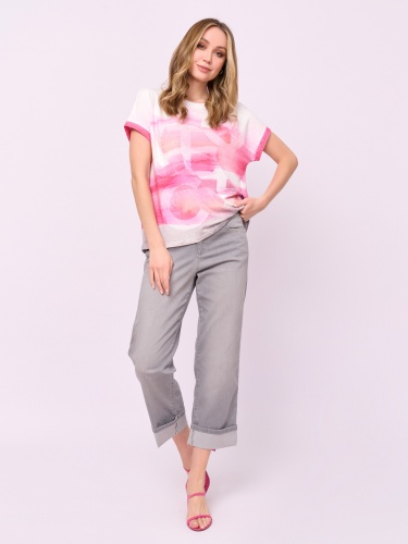 Детали: вырез горловины округлый, покрой прямой, рисунок абстракция, без надписи, стразы. Длина по спинке: 58 см.