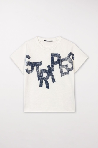 Футболка спортивного стиля повседневного силуэта с короткими рукавами реглан. Дизайн дополнен привлекательной надписью спереди и слегка закругленными краями.