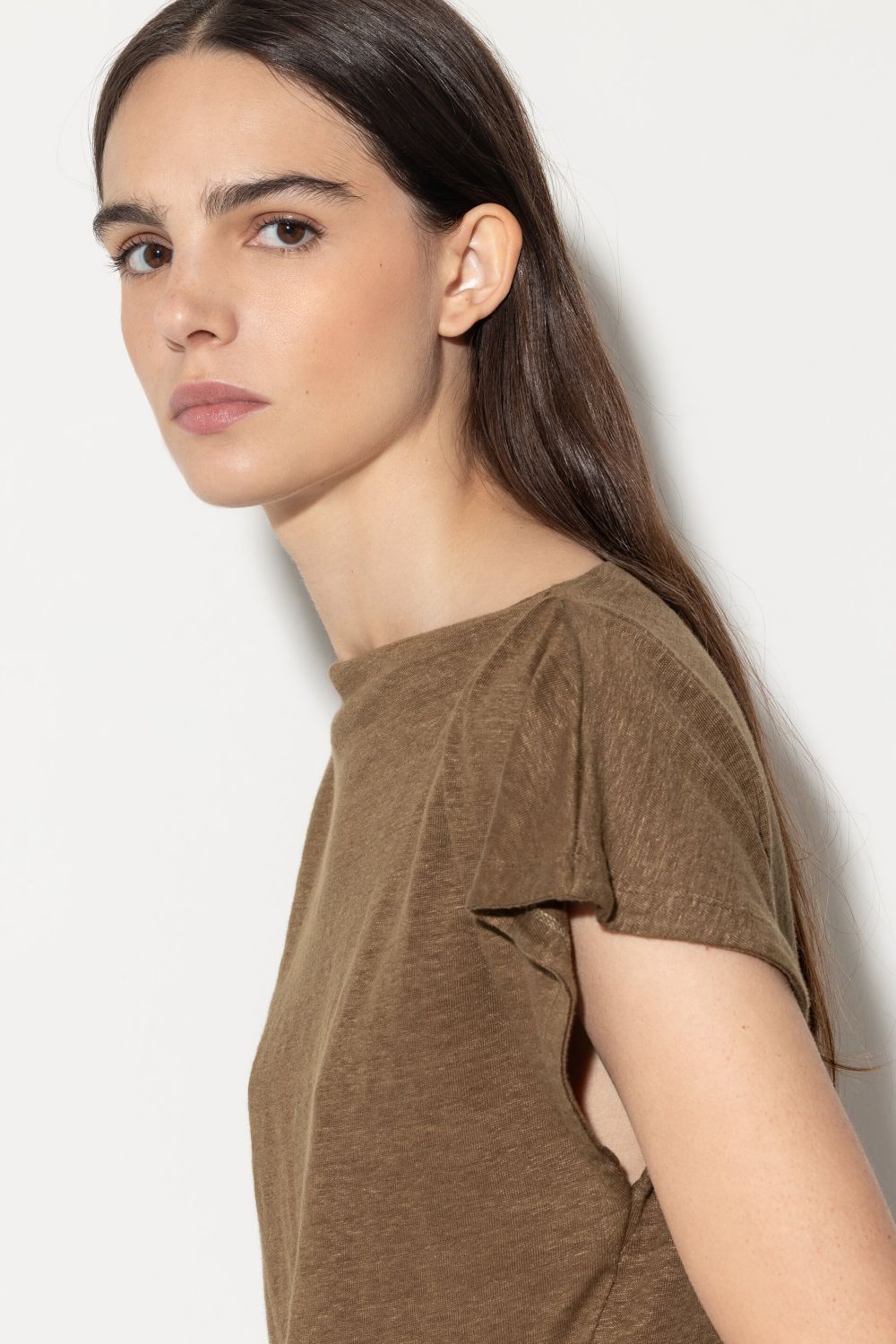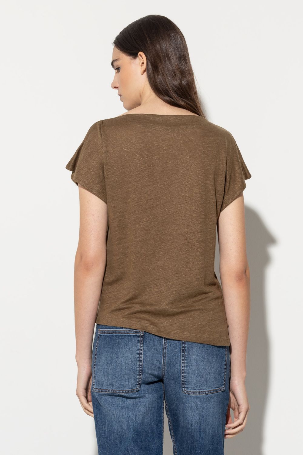 Повседневная футболка из высококачественного льняного трикотажа с укороченными рукавами и рюшами на плечах. Асимметричный подол имеет разрез сбоку.