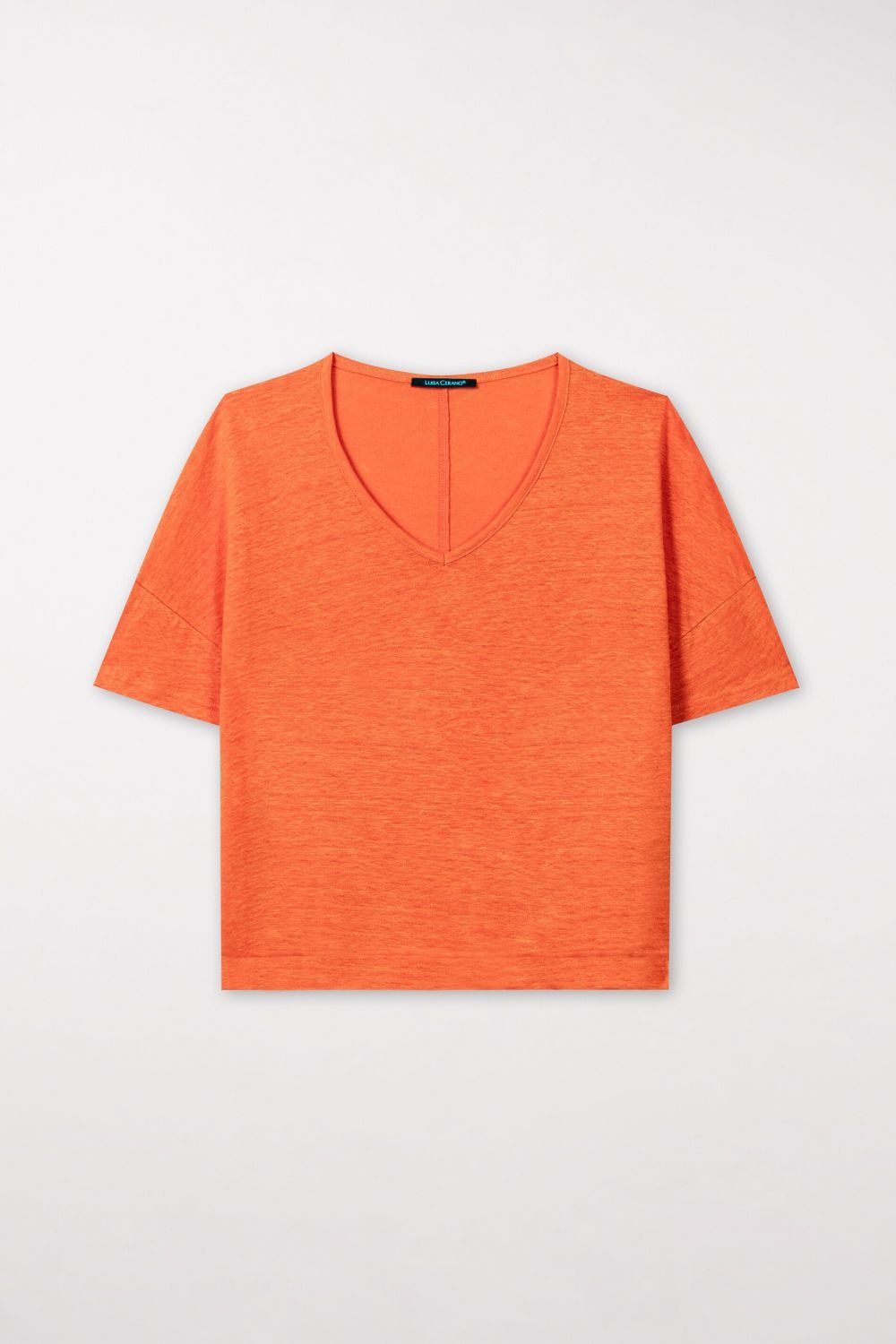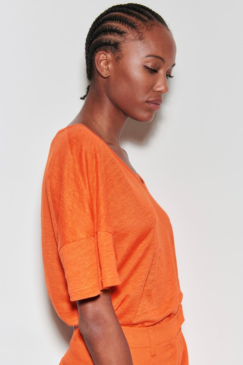 Футболка повседневного свободного кроя из высококачественного льняного трикотажа. Рубашка имеет женственный V-образный вырез и разрез по бокам.