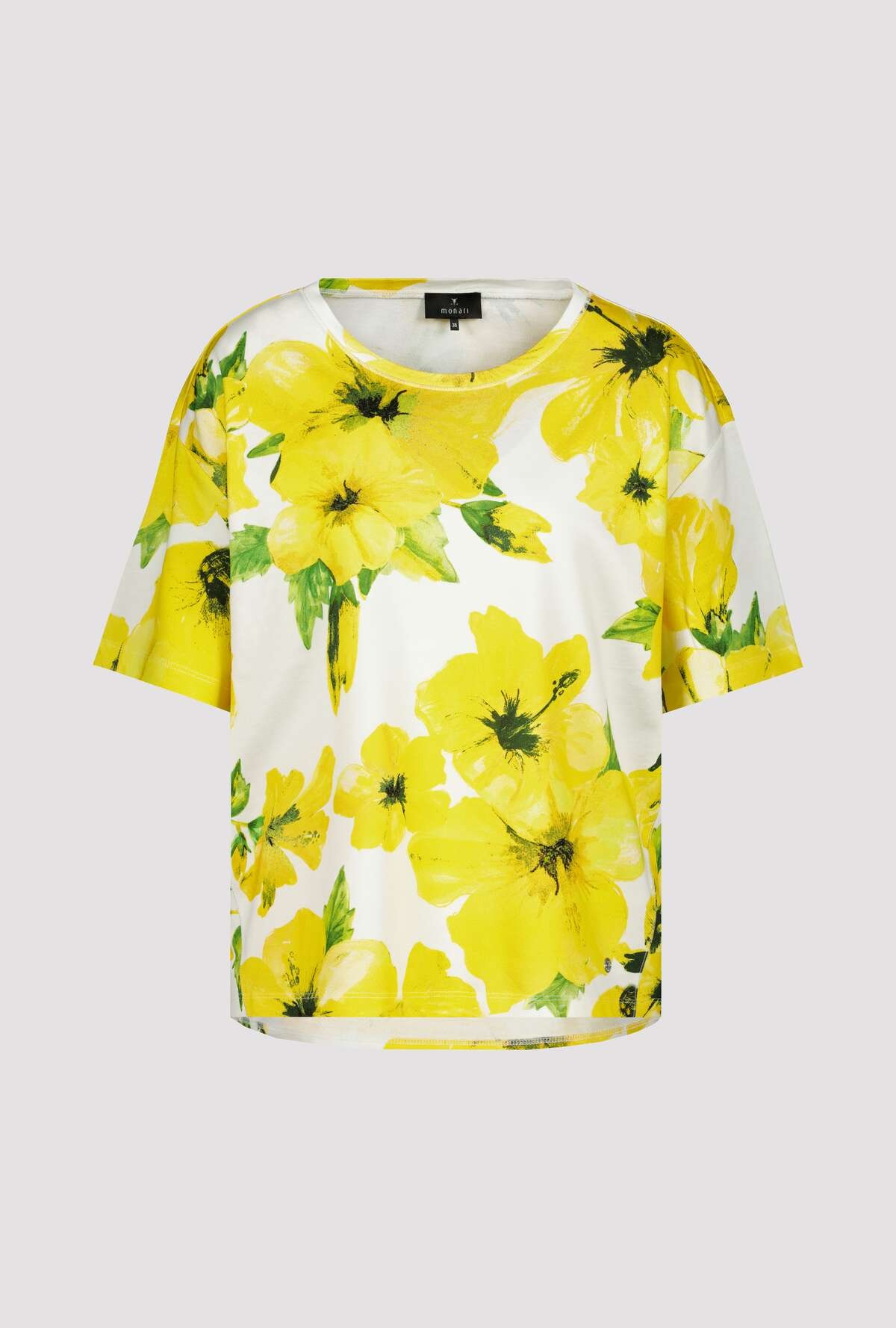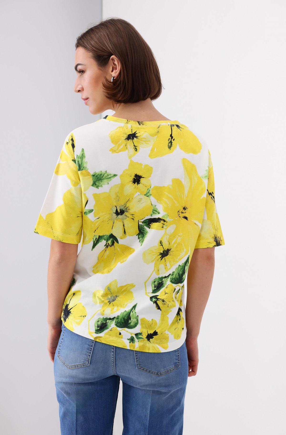 Футболка с цветочным принтом по всей поверхности изготовлена из высококачественной смеси хлопка и создает свежий и женственный образ. Регулярная посадка. Круглый вырез. Короткий рукав. Удлиненная закругленная спина. Длина спинки 44-го размера составляет 65 см, длина переда 62 см.