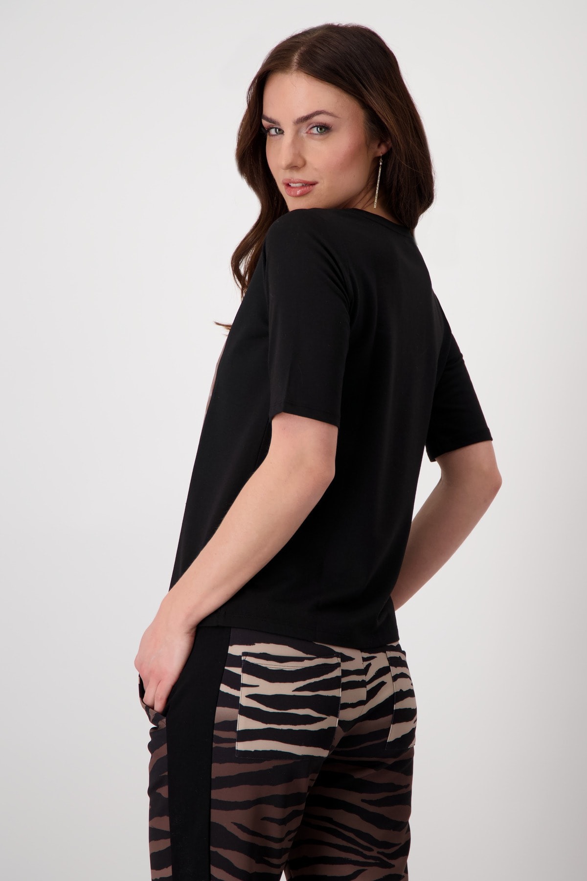 Стильная футболка из высококачественного смесового хлопка, украшенная сверкающими надписями из стразов. Круглый вырез. 1/2 руки. Длина 44 размера 62 см.
