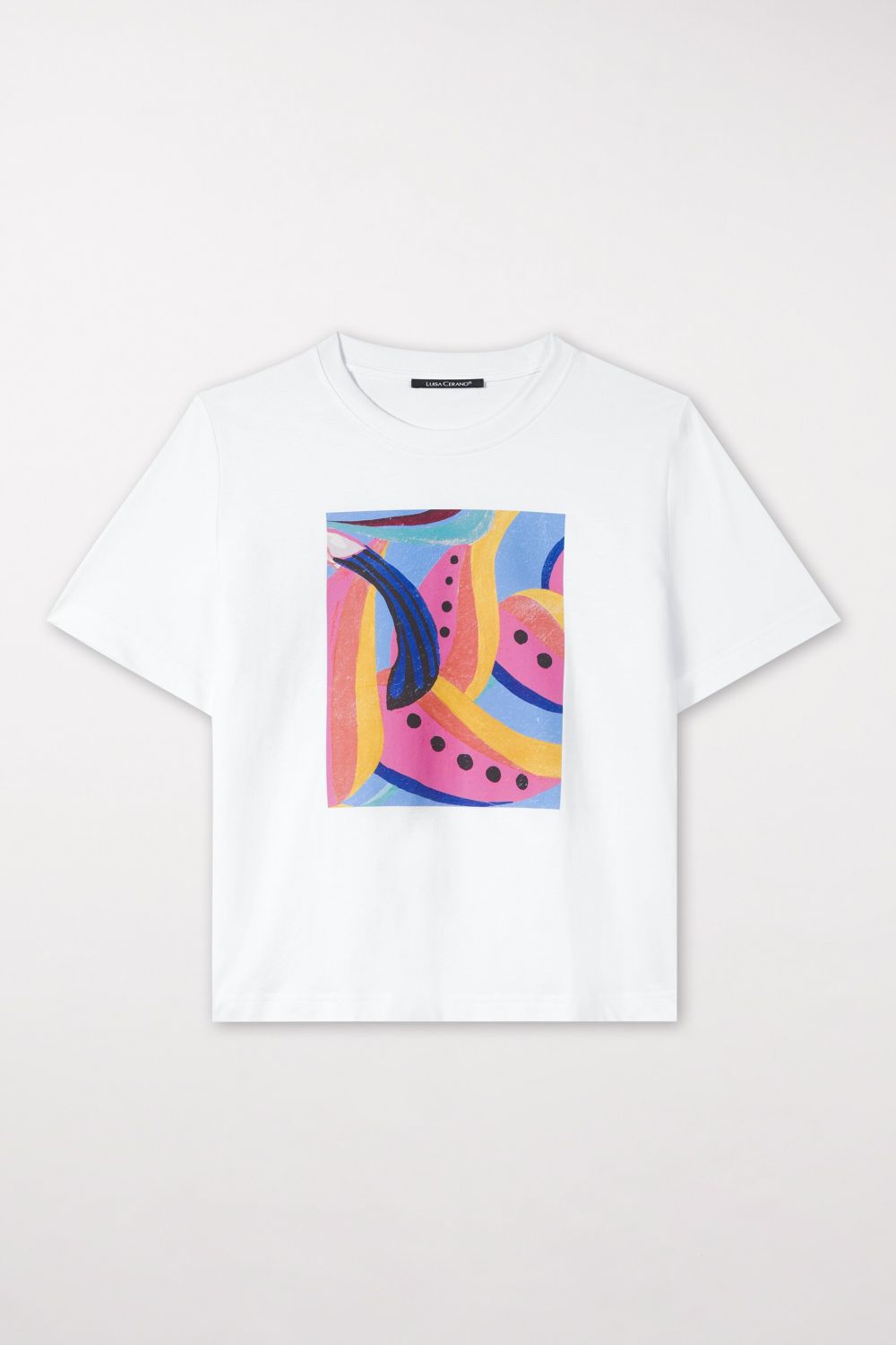 Футболка из натурального хлопка с гладкой поверхностью. Футболка классического кроя украшена ярким абстрактным принтом.