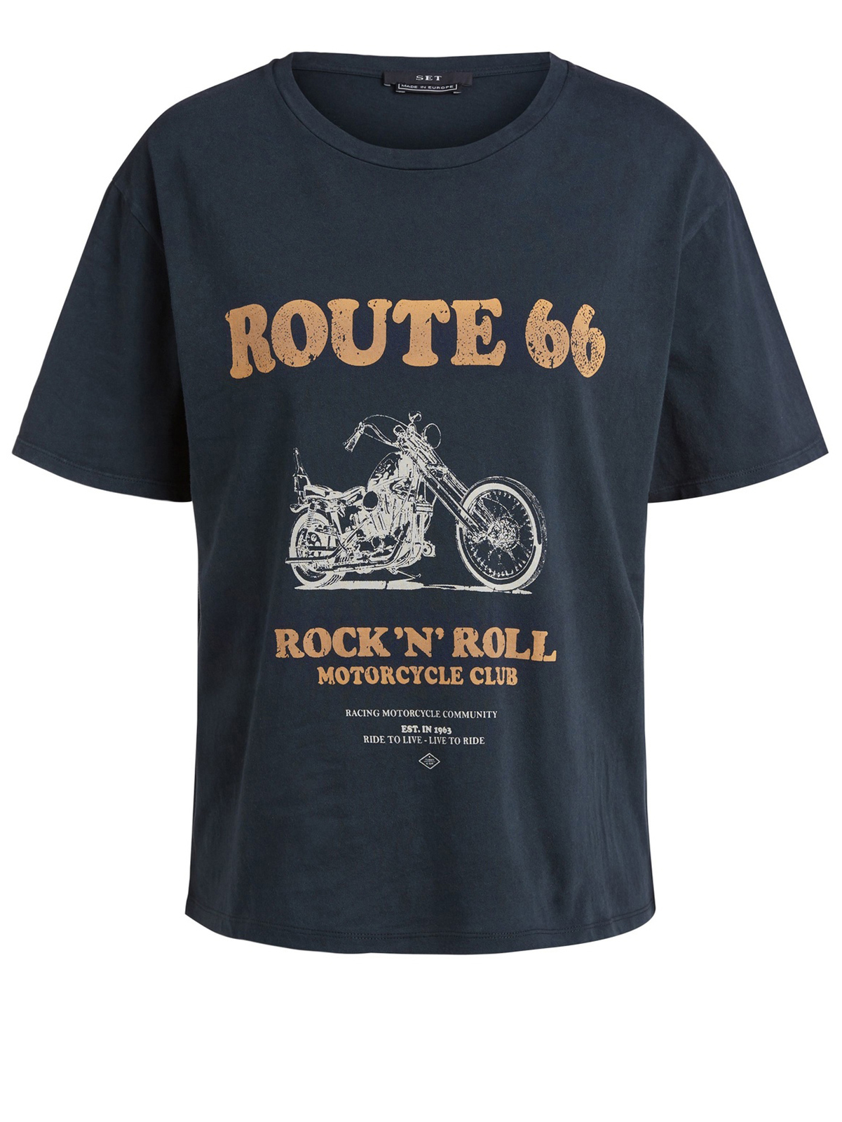 Черная футболка с принтом в винтажном стиле. Свободный силуэт подходит для любого типа фигуры. Широкий овальный вырез горловины оголяет шею, придает образу притягательную небрежность. Футболка идеально дополнит образ в стиле кэжуал или гранж.