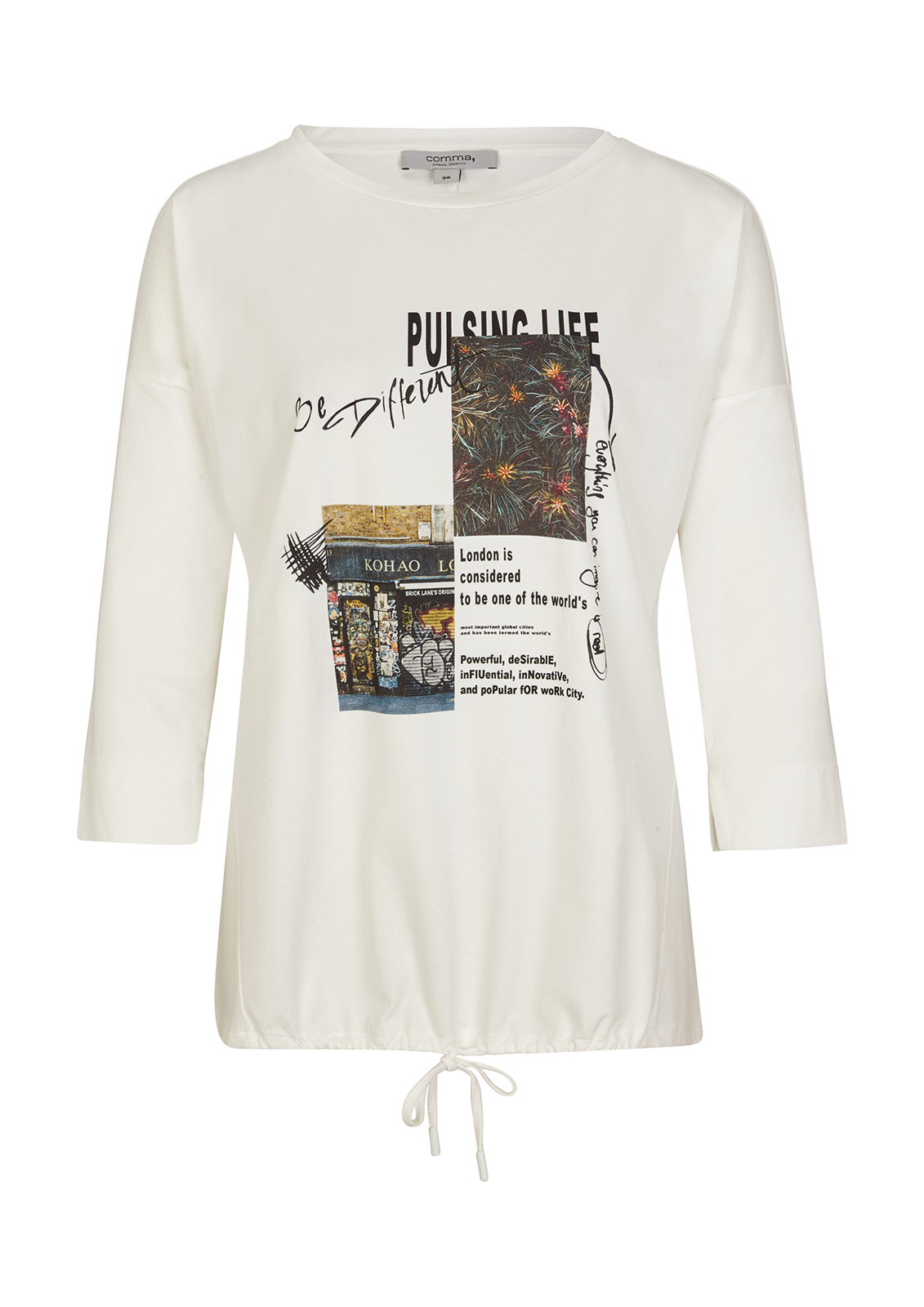 Футболка с принтом. Втачной рукав ¾ со спущенной линией плеча. Кулиска по низу изделия. Материал из смесового хлопка приятен к телу и комфортен в ношении.