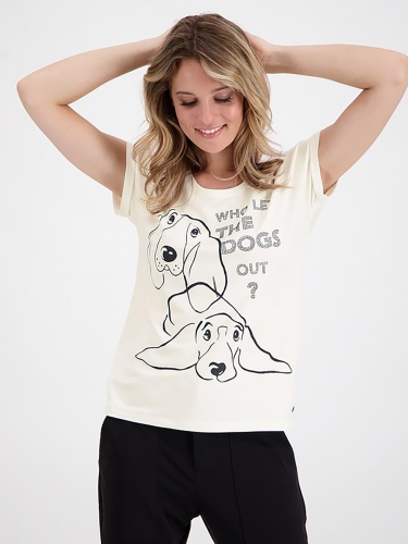 Футболка свободного кроя – практичная и удобная вещь на повседневность. Широкая овальная горловина, цельнокроеный короткий рукав с фиксированными манжетами. Принт на переде футболки украшают стразы. Материал приятен к телу и комфортен в носке.