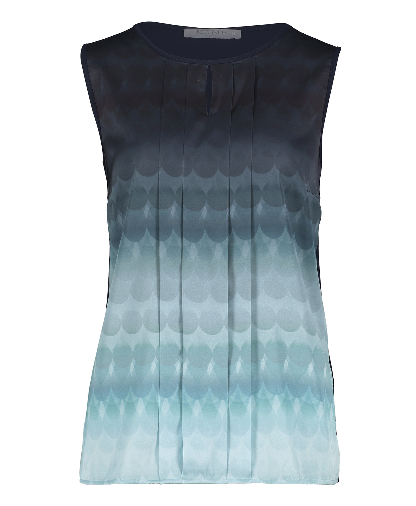 В этом топе привлекает внимание абстрактный принт с эффектом градиент. Спинка изделия выполнена из однотонного темно-синего материала. Горловина "замочная скважина". Приятный к телу материал из вискозной смеси. Данная модель отлично смотрится как с брюками, так и с юбкой-карандашом.