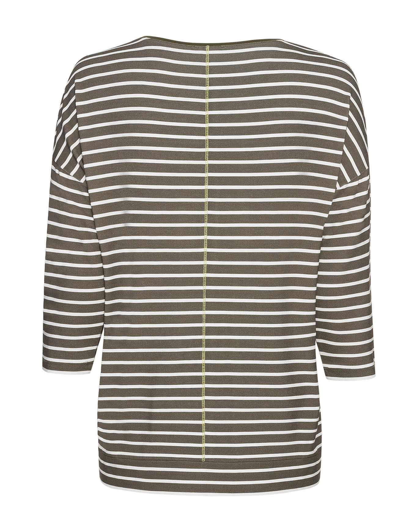 В неповторимом дизайне футболки гармонично сочетаются различные принты. Принт на передней части изделия выполнен из легкой вискозы, а рукава и спинка - из полосатого эластичного трикотажа. Удлиненные рукава со спущенным плечом и вырез "лодочка" идеально дополняют образ. • мягкая вискоза с трикотажем • сочетание трендовых принтов • рукав 3/4, спущенное плечо, горловина "лодочка", свободный покрой • длина около 66 см