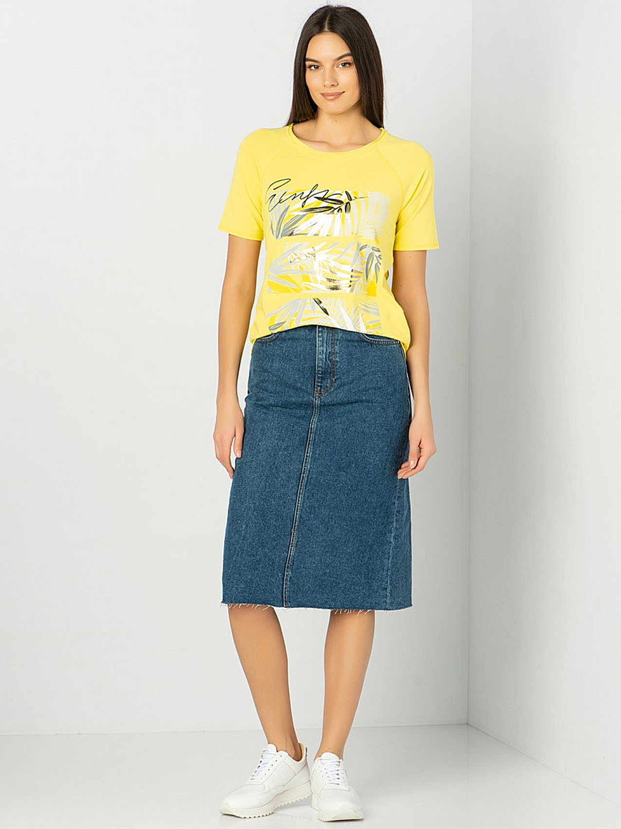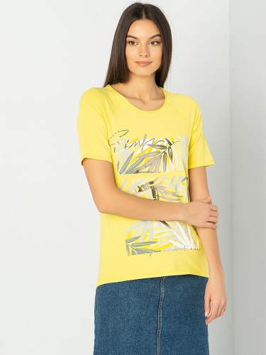 Яркая футболка - залог солнечного настроения! Трендовый принт с тропическими мотивами подчеркнет вкус обладательницы футболки. Вырез "лодочка", рукава реглан. Приятный к телу материал из смеси хлопка и эластана.