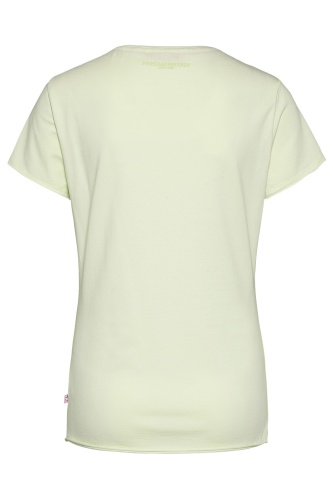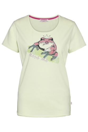 Футболка полуприлегающего силуэта обратит на себя внимание благодаря забавному принту с лягушкой. Материал из хлопка и эластана обеспечит комфорт и отличную посадку на фигуре. Эта модель хорошо будет смотреться как с брюками, так и с юбкой.