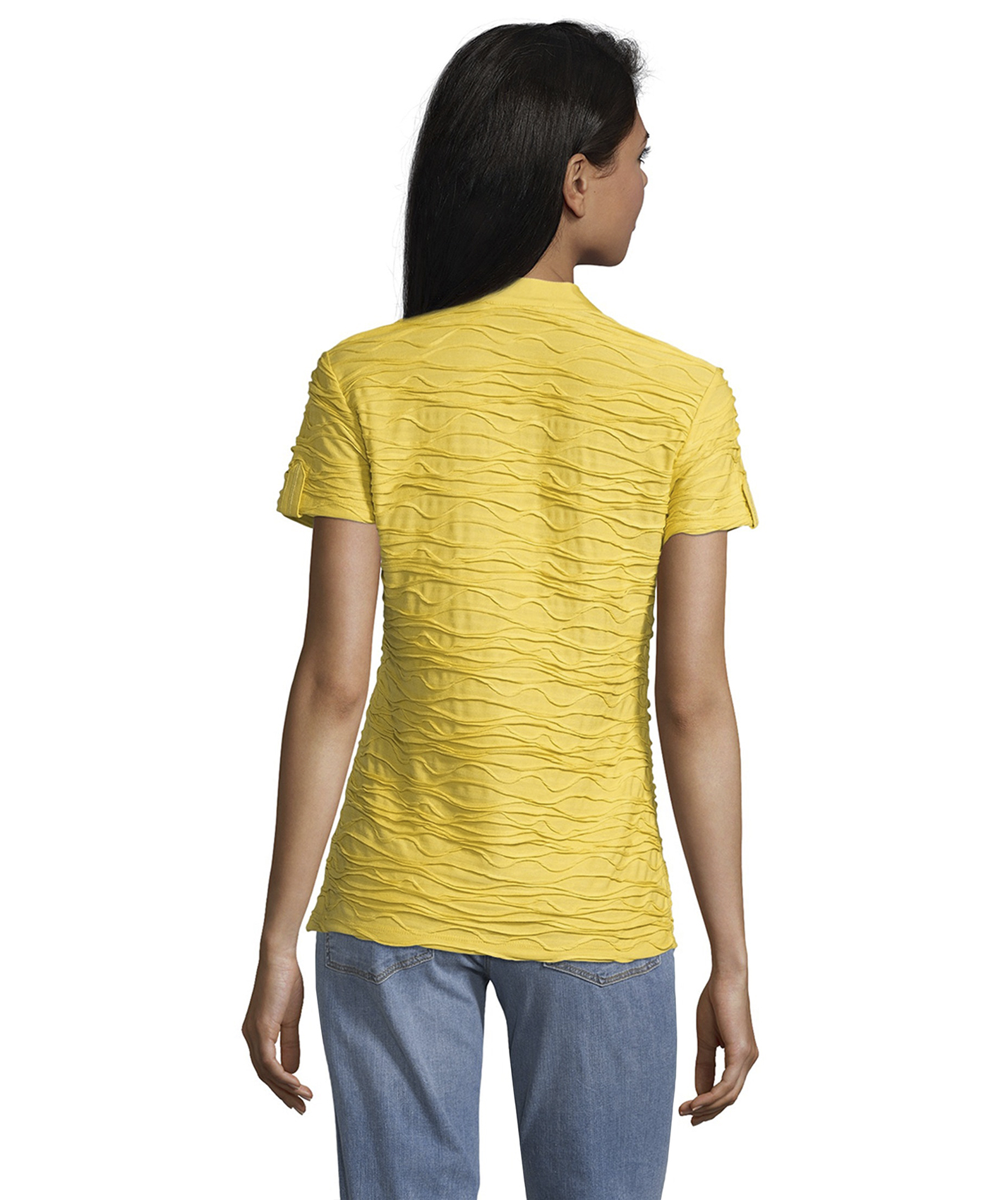Однотонная футболка прямого покроя - абсолютно необходимая вещь в гардеробе. Короткие рукава, V-образный вырез горловины с отделкой тесьмой. Интересная фактура ткани привлекает внимание. Футболка отлично сочетается как с брюками, так и с юбкой.