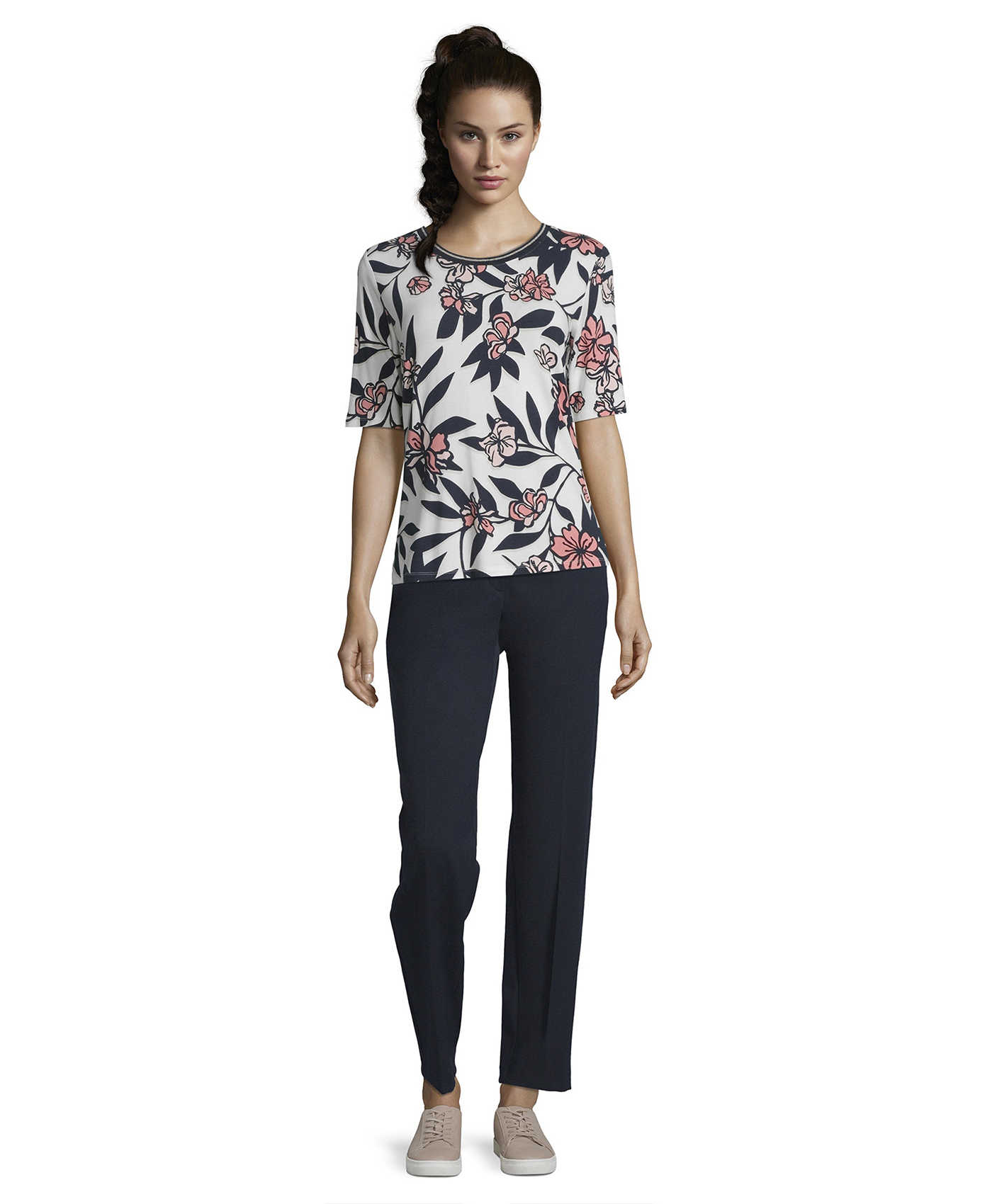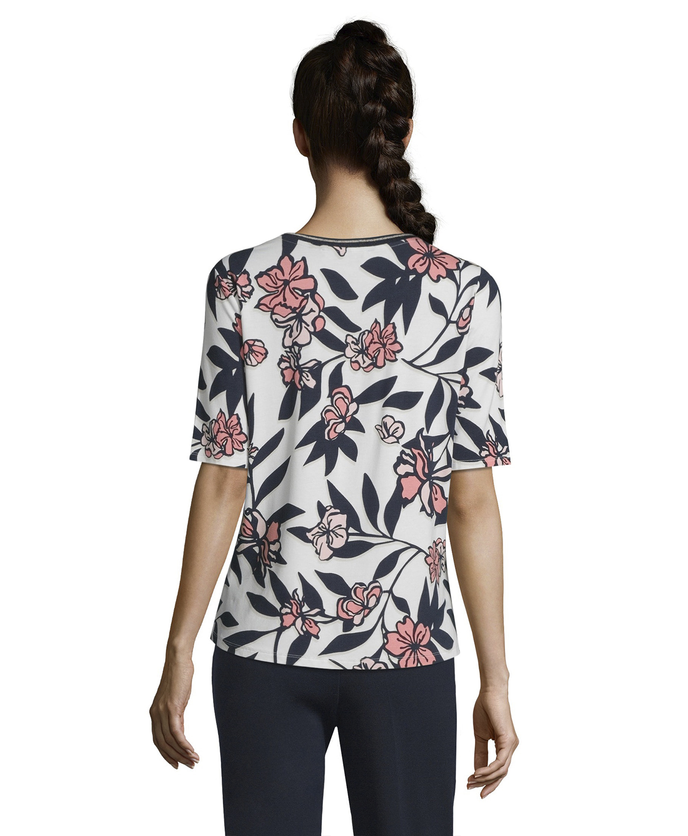 Цветочный принт - непреходящий тренд! Прямой покрой, круглый вырез горловины, рукава 1/2. Вискозная смесь приятна к телу и обеспечивает комфорт. Эта футболка идеально сочетается с любым однотонным низом и обувью.