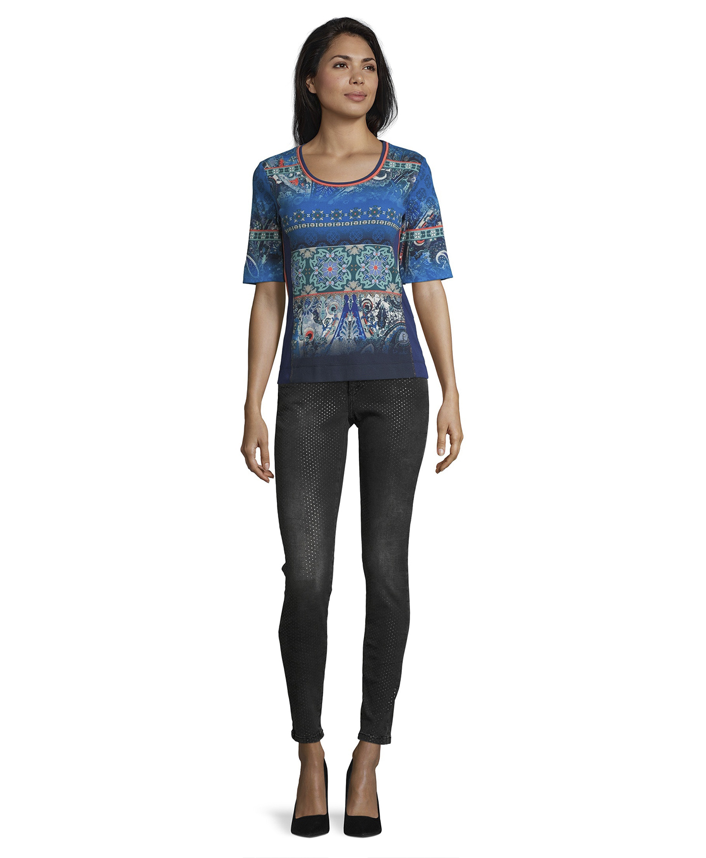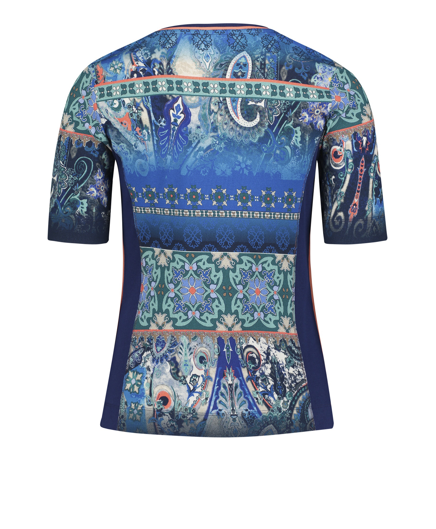 Футболка приталенного силуэта подчеркивает достоинства фигуры. Круглый вырез горловины, рукава 1/2. Материал из хлопковой смеси обеспечивает комфорт. Этнический принт и красивое сочетание контрастных цветов непременно обратят на себя внимание. Эта яркая вещь освежит любой комплект одежды!