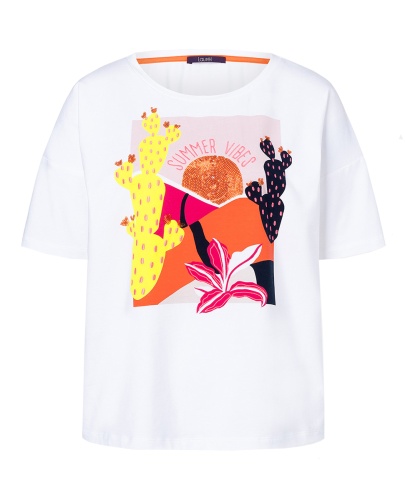 Яркий принт этой футболки непременно привлечет внимание! Футболка свободного силуэта. Круглый вырез горловины, короткие рукава со спущенным плечом. Приятный к телу материал из хлопковой смеси.