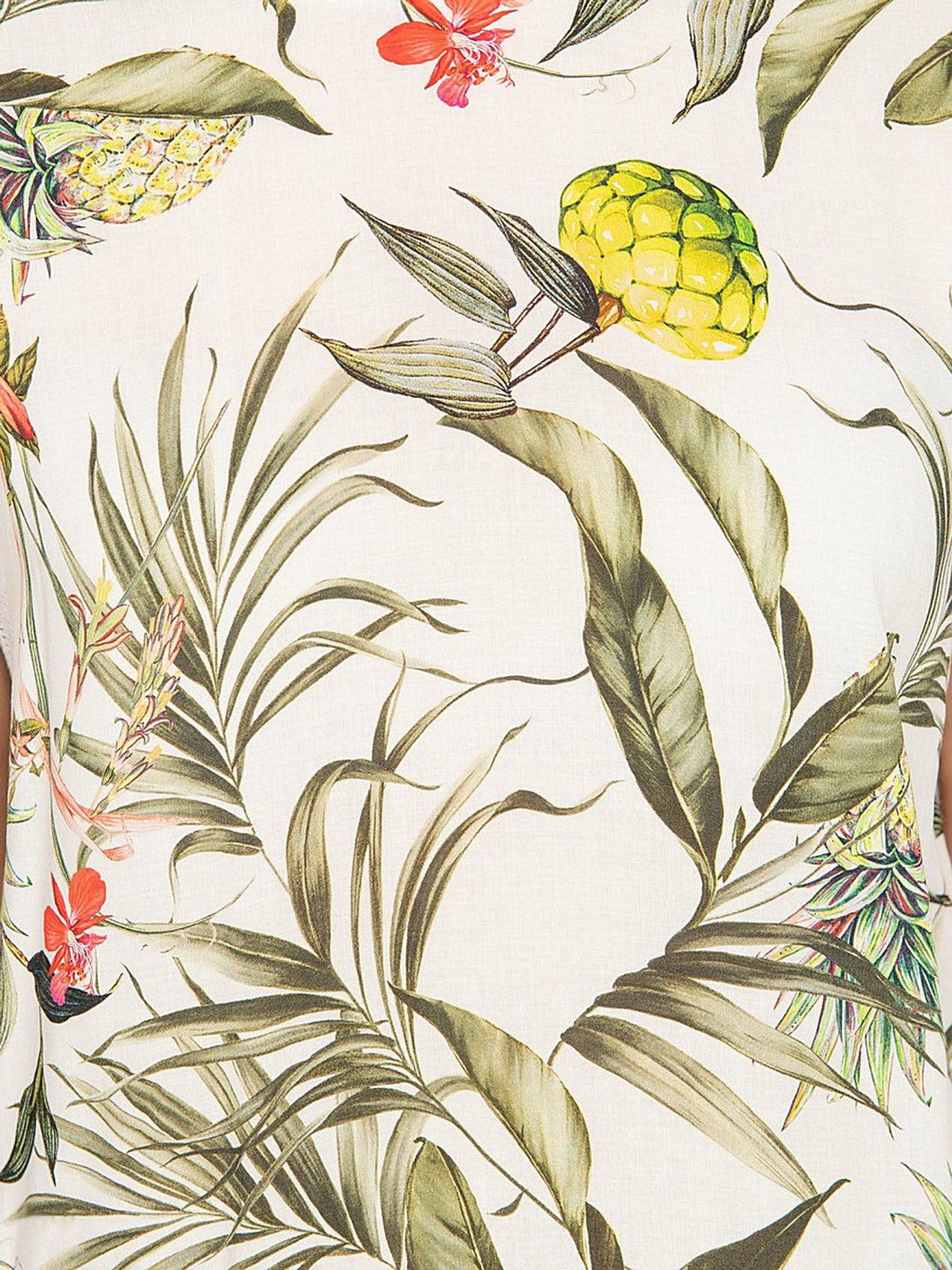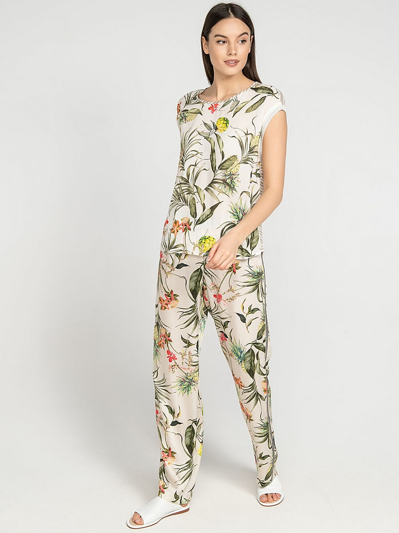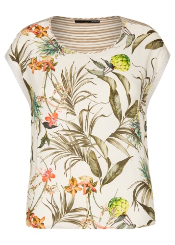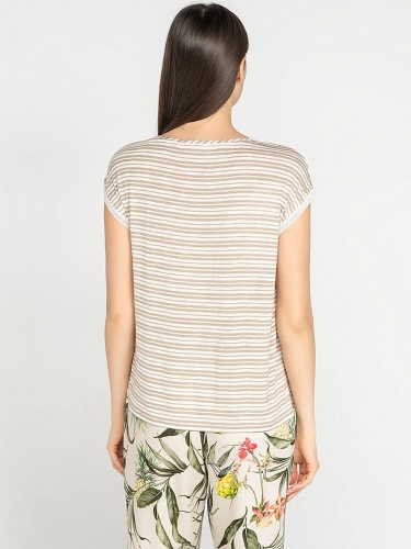 Удачное сочетание трендов - тропический принт спереди и полоска на спинке футболки. Прямой покрой, короткие цельнокроеные рукава. Приятный к телу материал из смеси вискозы и эластана. Отличный выбор для весенне-летнего сезона!