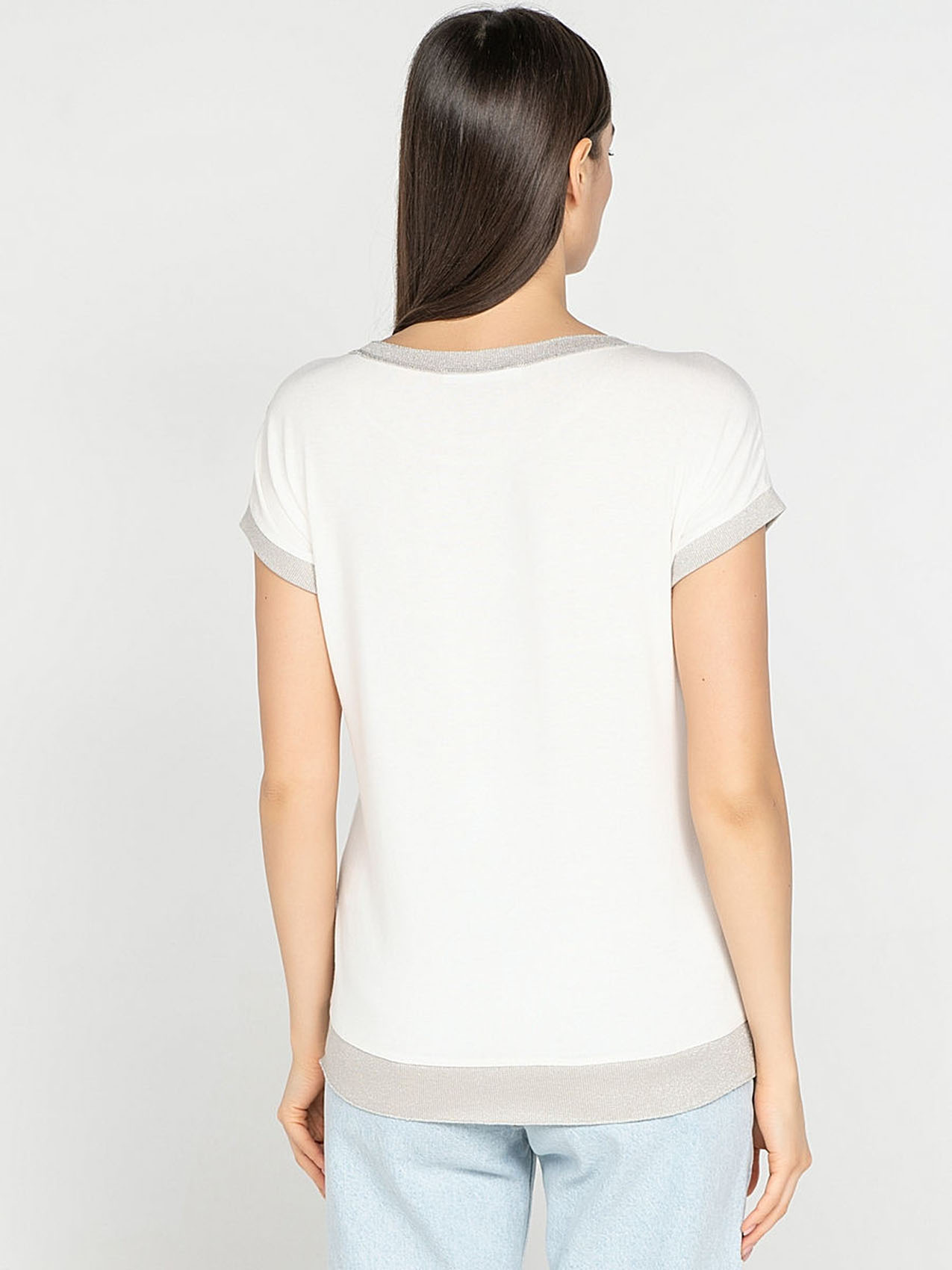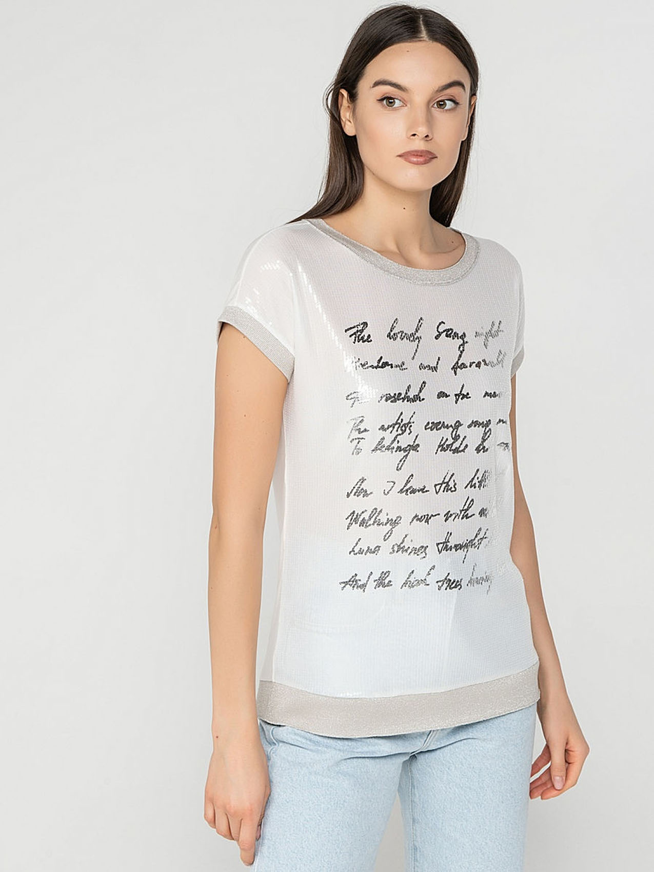 Элегантная футболка из ткани с пайетками. Слегка приталенный силуэт. Короткие цельнокроеные рукава. Приятный к телу материал из смеси вискозы и эластана.